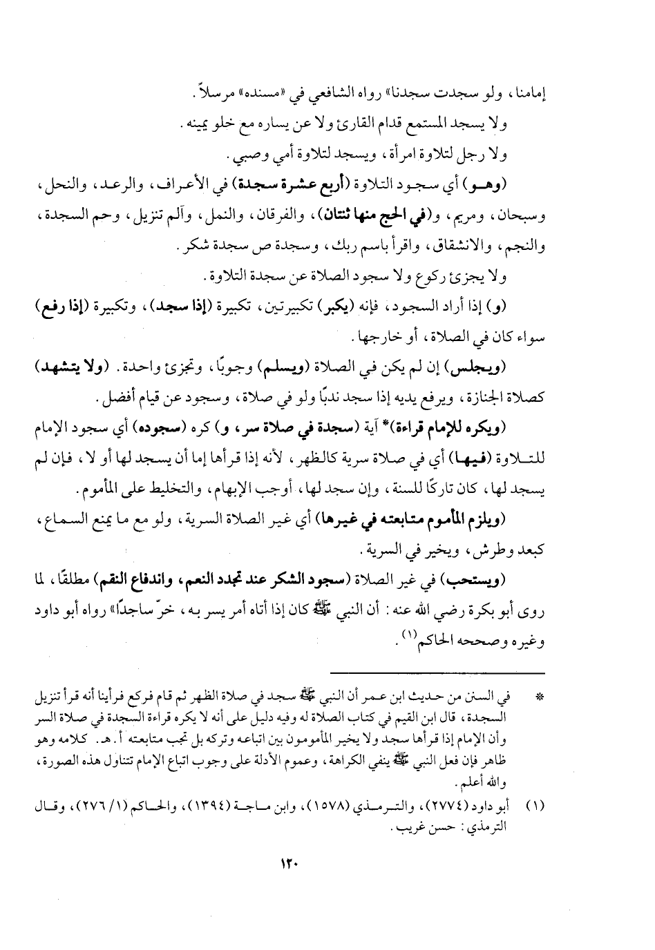 إمامنا ولو سجدت سجدنا» ، رواه الشافعي في " مسنده " مرسلا، ولا يسجد المستمع قدام القارئ، ولا عن يساره مع خلو يمينه، ولا رجل لتلاوة امرأة ويسجد لتلاوة أمي وصبي، (وهو) أي سجود التلاوة (أربع عشرة سجدة) في الأعراف والرعد والنحل والإسراء ومريم و (في الحج منها ثنتان) والفرقان والنمل والم تنزيل وحم السجدة والنجم والانشقاق واقرأ باسم ربك وسجدة ص سجدة شكر، ولا يجزئ ركوع ولا سجود الصلاة عن سجدة التلاوة.