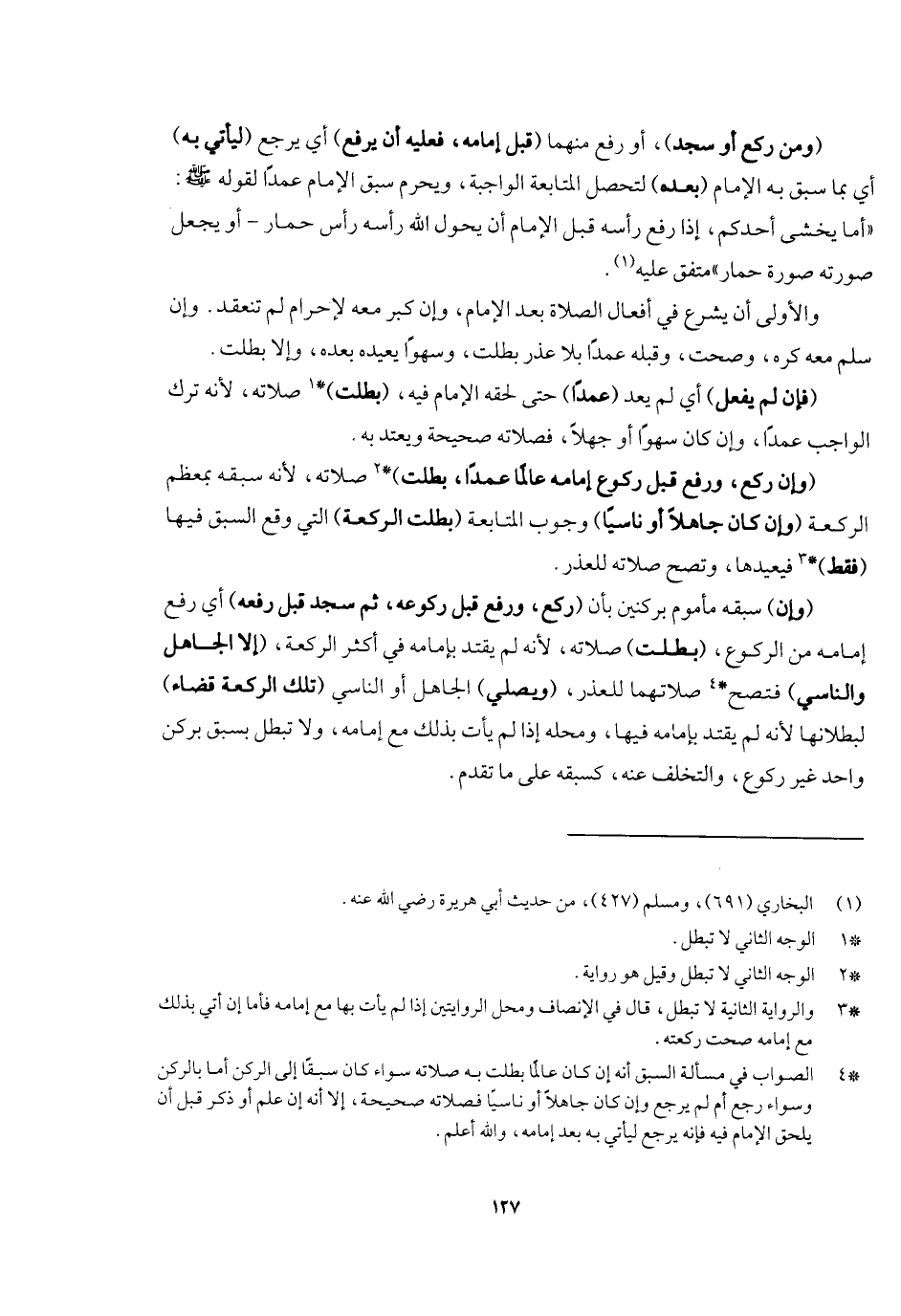 (ومن ركع، أو سجد) ، أو رفع منهما (قبل إمامه فعليه أن يرجع) أي يرجع (ليأتي به) أي بما سبق به الإمام (بعده) لتحصيل المتابعة الواجبة، ويحرم سبق الإمام عمدا؛ لقوله - صَلَّى اللَّهُ عَلَيْهِ وَسَلَّمَ -: «أما يخشى أحدكم إذا رفع رأسه قبل الإمام أن يحول الله رأسه رأس حمار، أو يجعل صورته صورة حمار» متفق عليه. والأولى أن يشرع في أفعال الصلاة بعد الإمام، وإن كبر معه لإحرام لم تنعقد، وإن سلم معه كره وصح وقبله عمدا بلا عذر بطلت وسهوا يعيده بعده وإلا بطلت، (فإن لم يفعل) أي لم يعد (عمدا) حتى لحقه الإمام فيه (بطلت) صلاته؛ لأنه ترك الواجب عمدا، وإن كان سهوا، أو جهلا فصلاته صحيحة ويعتد به (وإن ركع ورفع قبل ركوع إمامه عالما عمدا بطلت) صلاته؛ لأنه سبقه بمعظم الركعة، (وإن كان جاهلا، أو ناسيا) وجوب المتابعة (بطلت الركعة) التي وقع السبق فيها (فقط) فيعيدها، وتصح صلاته للعذر، (وإن) سبقه مأموم بركنين بأن (ركع ورفع قبل ركوعه، ثم سجد قبل رفعه) أي رفع إمامه من الركوع (بطلت) صلاته؛ لأنه لم يقتد بإمامه في أكثر الركعة، (إلا الجاهل والناسي) فتصح صلاتهما للعذر (ويصلي) الجاهل، أو الناسي (تلك الركعة قضاء) لبطلانها؛ لأنه لم يقتد بإمامه فيها ومحله إذا لم يأت بذلك مع إمامه، ولا تبطل بسبق بركن واحد غير ركوع والتخلف عنه كسبقه على ما تقدم.