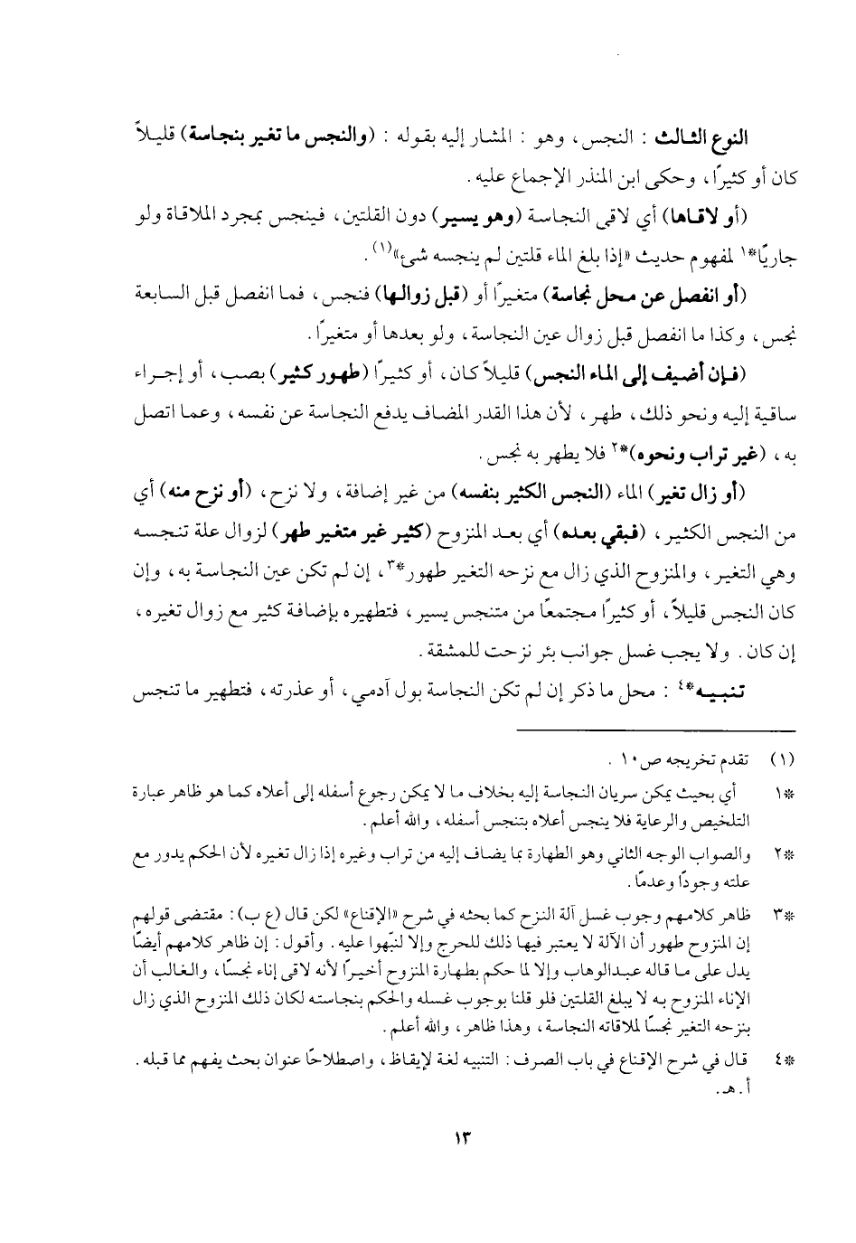 النوع الثالث - النجس، وهو ما المشار إليه بقوله: (والنجس ما تغير بنجاسة) قليلا كان أو كثيرا، وحكى ابن المنذر الإجماع عليه (أو لاقاها) أي لاقى النجاسة (وهو يسير) دون القلتين فينجس بمجرد الملاقاة ولو جاريا لمفهوم حديث «إذا بلغ الماء قلتين لم ينجسه شيء» (أو انفصل عن محل نجاسة) متغيرا أو (قبل زوالها) فنجس، فما انفصل قبل السابعة نجس، وكذا ما انفصل قبل زوال عين النجاسة ولو بعدها أو متغيرا، (فإن أضيف إلى الماء النجس) قليلا كان أو كثيرا (طهور كثير) بصب أو إجراء ساقية إليه ونحو ذلك طهر؛ لأن هذا القدر المضاف يدفع النجاسة عن نفسه وعما اتصل به (غير تراب ونحوه) فلا يطهر به نجس (أو زال تغير) الماء (النجس الكثير بنفسه) من غير إضافة ولا نزح (أو نزح منه) أي من النجس الكثير (فبقي بعده) أي بعد المنزوح (كثير غير متغير طهر) لزوال علة تنجسه وهي التغير، والمنزوح الذي زال مع نزحه التغير طهور إن لم تكن عين النجاسة به، وإن كان النجس قليلا أو كثيرا مجتمعا من متنجس يسير فتطهيره بإضافة كثير مع زوال تغيره إن كان. ولا يجب غسل جوانب بئر نزحت للمشقة.