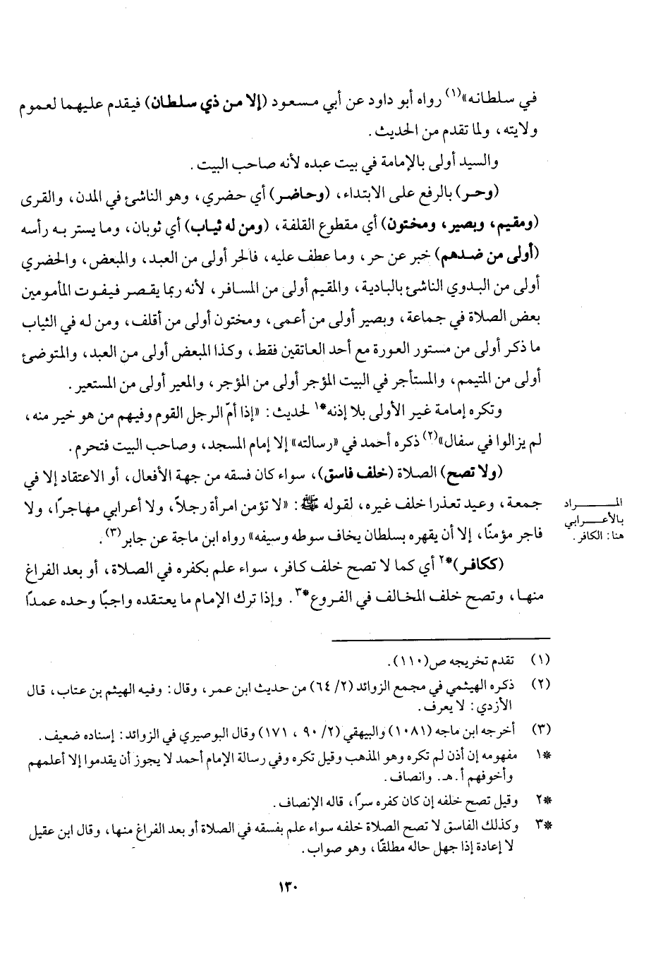لعموم ولايته ولما تقدم من الحديث والسيد أولى بالإمامة في بيت عبده؛ لأنه صاحب البيت (وحر) بالرفع على الابتداء (وحاضر) أي حضري، وهو الناشئ في المدن والقرى (ومقيم وبصير ومختون) أي مقطوع القلفة، (ومن له ثياب) أي ثوبان وما يستر به رأسه (أولى من ضدهم) خبر عن حر وما عطف عليه فالحر أولى من العبد والمبعض والحضري أولى من البدوي الناشئ بالبادية والمقيم أولى من المسافر؛ لأنه ربما يقصر فيفوت المأمومين بعض الصلاة في جماعة وبصير أولى من أعمى ومختون أولى من أقلف، ومن له من الثياب ما ذكر أولى من مستور العورة مع أحد العاتقين فقط، وكذا المبعض أولى من العبد والمتوضئ أولى من المتيمم والمستأجر في البيت المؤجر أولى من المؤجر والمعير أولى من المستعير وتكره إمامة غير الأولى بلا إذنه لحديث: «إذا أم الرجل القوم وفيهم من هو خير منه لم يزالوا في سفال» ذكره أحمد في " رسالته " إلا إمام المسجد وصاحب البيت فتحرم.