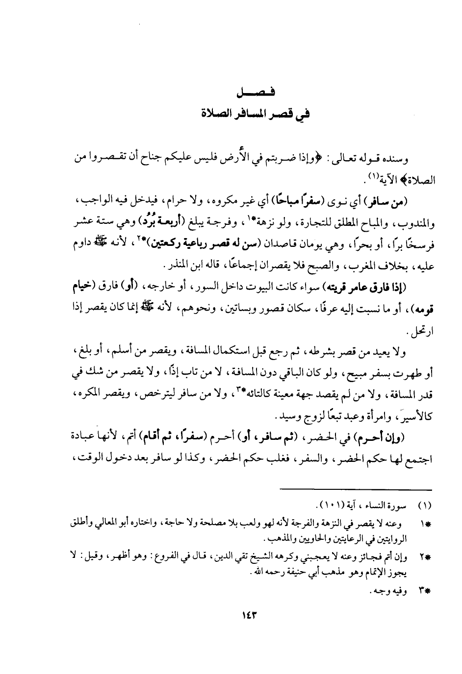وسنده قَوْله تَعَالَى: {وَإِذَا ضَرَبْتُمْ فِي الأَرْضِ فَلَيْسَ عَلَيْكُمْ جُنَاحٌ أَنْ تَقْصُرُوا مِنَ الصَّلاةِ} [النساء: ١٠١] الآية. (من سافر) أي نوى (سفرا مباحا) أي غير مكروه، ولا حرام فيدخل فيه الواجب والمندوب والمباح المطلق، ولو نزهة وفرجة يبلغ (أربعة برد) ، وهي ستة عشر فرسخا برا، أو بحرا، وهي يومان قاصدان (سن له قصر رباعية ركعتين) ؛ لأنه - صَلَّى اللَّهُ عَلَيْهِ وَسَلَّمَ - داوم عليه بخلاف المغرب والصبح فلا يقصران إجماعا، قاله ابن المنذر (إذا فارق عامر قريته) سواء كانت البيوت داخل السور، أو خارجه، (أو) فارق (خيام قومه) ، أو ما نسبت إليه عرفا كسكان قصور وبساتين ونحوهم؛ لأنه - صَلَّى اللَّهُ عَلَيْهِ وَسَلَّمَ - إنما كان يقصر إذا ارتحل، ولا يعيد من قصر بشرطه، ثم رجع قبل استكمال المسافة، ويقصر من أسلم، أو بلغ، أو طهرت بسفر مبيح، ولو كان الباقي دون المسافة لا من تاب إذا، ولا يقصر من شك في قصر المسافة، ولا من لم يقصد جهة