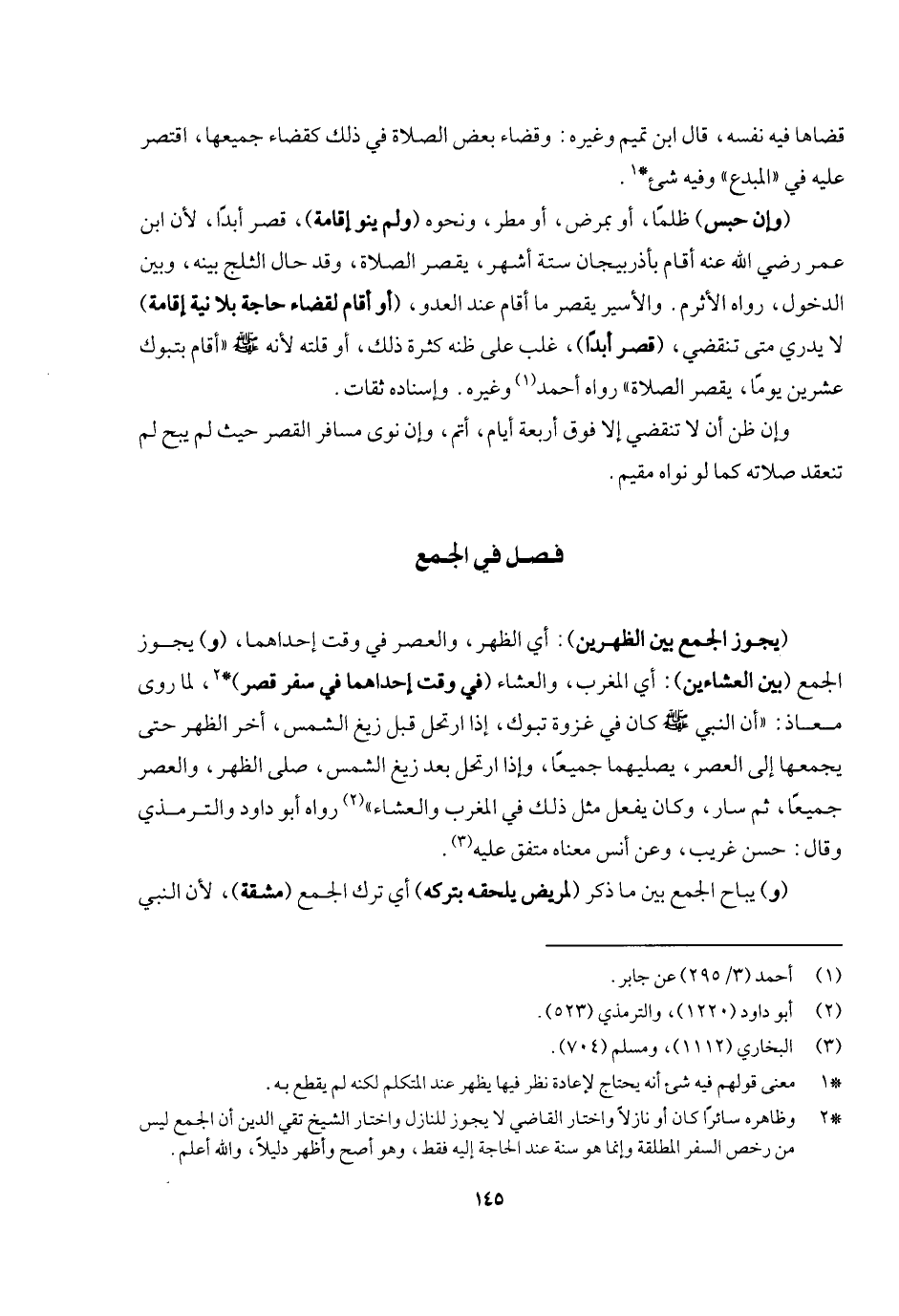 (ويجوز الجمع بين الظهرين) أي الظهر والعصر في وقت إحداهما (و) يجوز الجمع (بين العشاءين) أي المغرب والعشاء (في وقت إحداهما في سفر قصر) لما روى معاذ: «أن النبي - صَلَّى اللَّهُ عَلَيْهِ وَسَلَّمَ - كان في غزوة تبوك إذا ارتحل قبل زيغ الشمس أخر الظهر حتى يجمعها إلى العصر يصليهما جميعا، وإذا ارتحل بعد زيغ الشمس صلى الظهر والعصر جميعا، ثم سار، وكان يفعل مثل ذلك في المغرب والعشاء» رواه أبو داود والترمذي وقال: حسن غريب، وعن أنس بمعناه، متفق عليه.