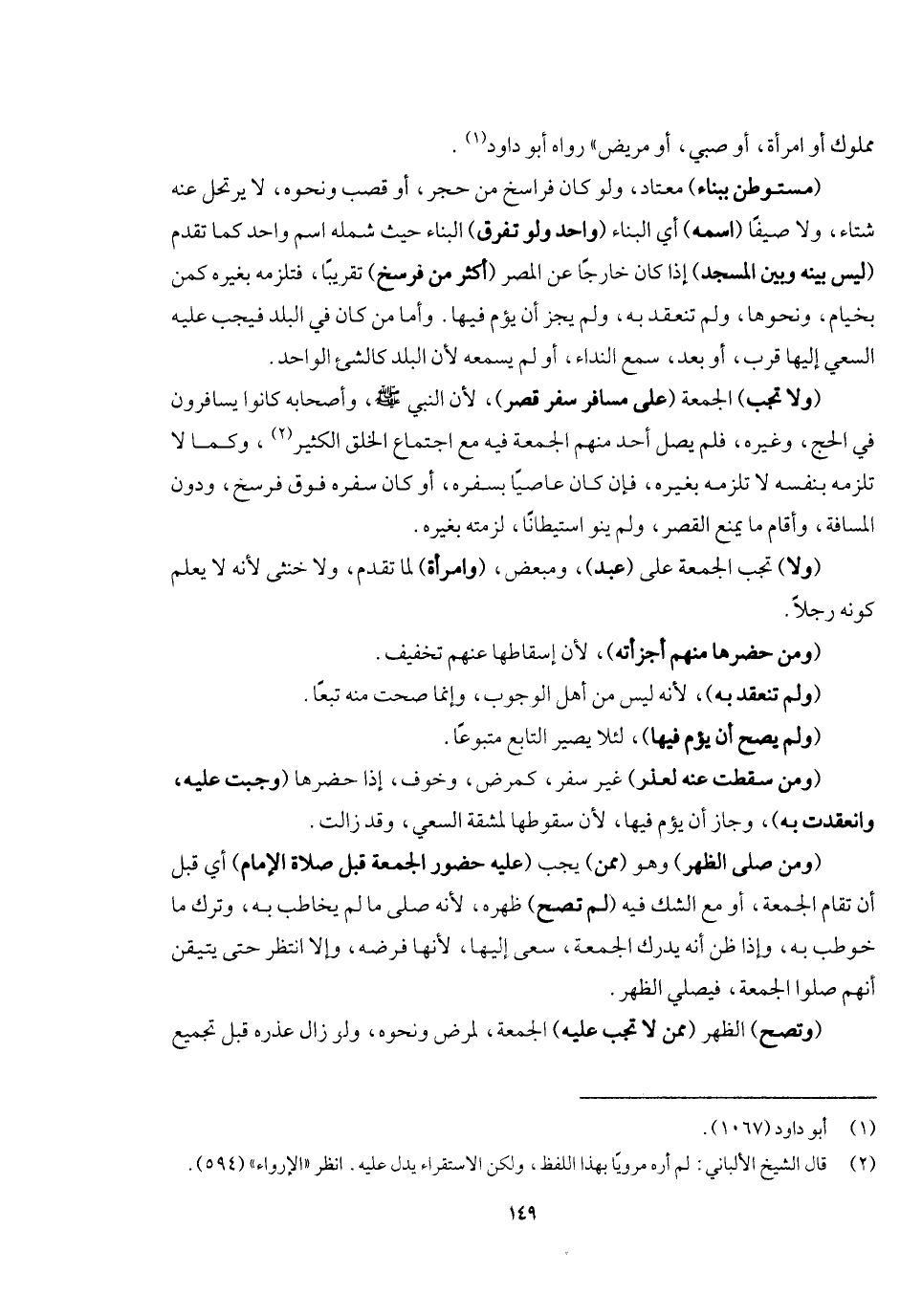 (ولا تجب) الجمعة (على مسافر سفر قصر) ؛ لأن النبي - صَلَّى اللَّهُ عَلَيْهِ وَسَلَّمَ - وأصحابه كانوا يسافرون في الحج وغيره فلم يصل أحد منهم الجمعة فيه مع اجتماع الخلق الكثير وكما لا تلزمه بنفسه لا تلزمه بغيره، فإن كان عاصيا بسفره، أو كان سفره فوق فرسخ ودون المسافة وأقام ما يمنع القصر ولم ينو استيطانا لزمته بغيره، (ولا) تجب الجمعة على (عبد) ومبعض (وامرأة) لما تقدم، ولا خنثى؛ لأنه لا يعلم كونه رجلا، (ومن حضرها منهم أجزأته) ؛ لأن إسقاطها عنهم تخفيف (ولم تنعقد به) ؛ لأنه ليس من أهل الوجوب، وإنما صحت منه تبعا و (لم يصح أن يؤم) فيها لئلا يصير التابع متبوعا، (ومن سقطت عنه لعذر) غير سفر كمرض وخوف إذا حضرها (وجبت عليه وانعقدت به) وجاز أن يؤم فيها؛ لأن سقوطها لمشقة السعي، وقد زالت.