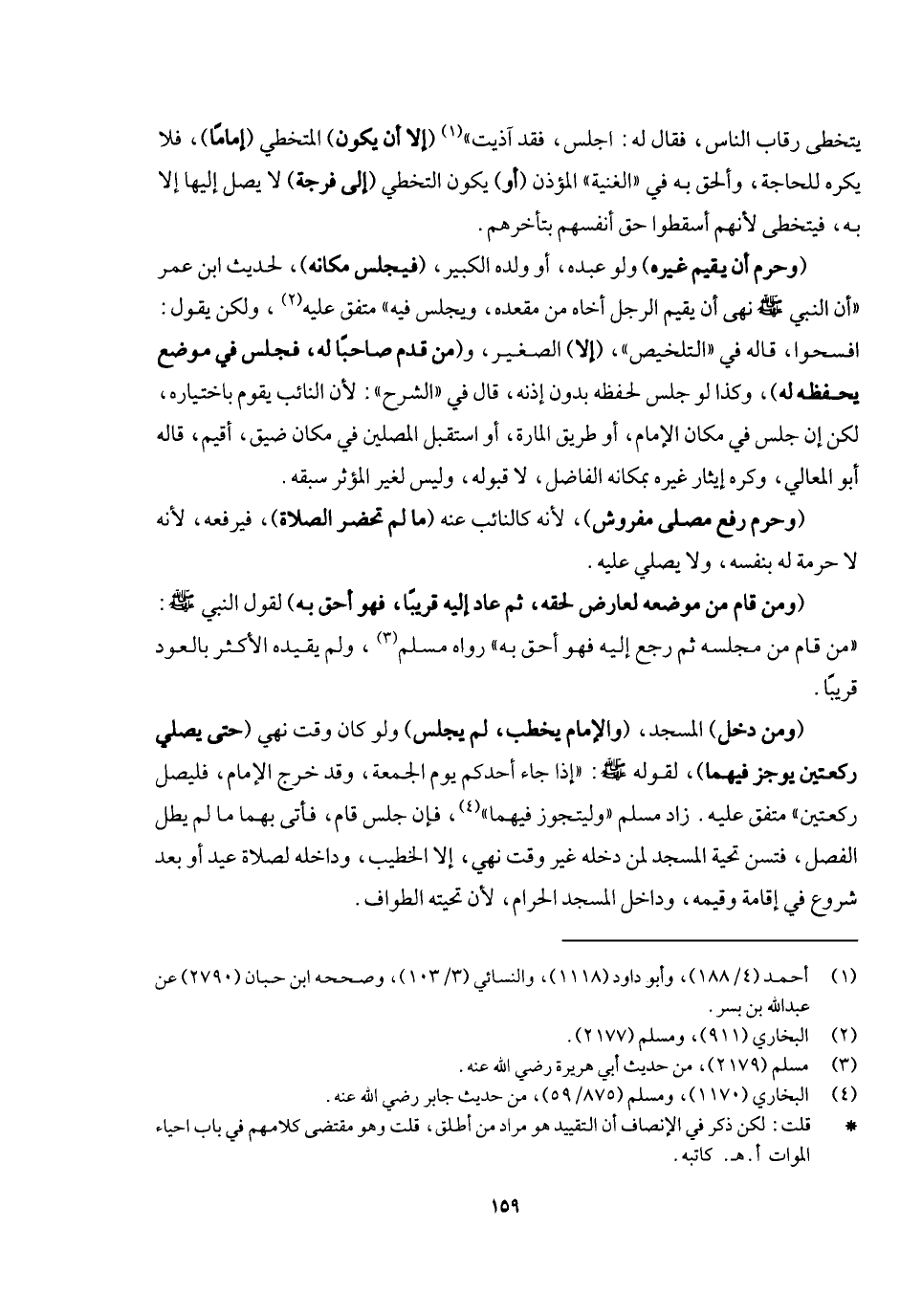 افسحوا، قاله في " التلخيص " (إلا) الصغير و (من قدم صاحبا له فجلس في موضع يحفظه له) ، وكذا لو جلس لحفظه بدون إذنه، قال في " الشرح ": لأن النائب يقوم باختياره لكن إن جلس مكان الإمام، أو طريق المارة، أو استقبل المصلين في مكان ضيق أقيم، قاله في المعالي، وكره إيثاره غيره بمكانه الفاضل لا قبوله وليس لغير المؤثر سبقه (وحرم رفع مصلى مفروش) ؛ لأنه كالنائب عنه (ما لم تحضر الصلاة) فيرفعه؛ لأنه لا حرمة له بنفسه، ولا يصلي عليه، (ومن قام من مكانه لعارض لحقه، ثم عاد إليه قريبا فهو أحق به) ؛ لقوله - صَلَّى اللَّهُ عَلَيْهِ وَسَلَّمَ -: «من قام من مجلسه، ثم رجع إليه فهو أحق به» رواه مسلم، ولم يقيده الأكثر بالعود قريبا.