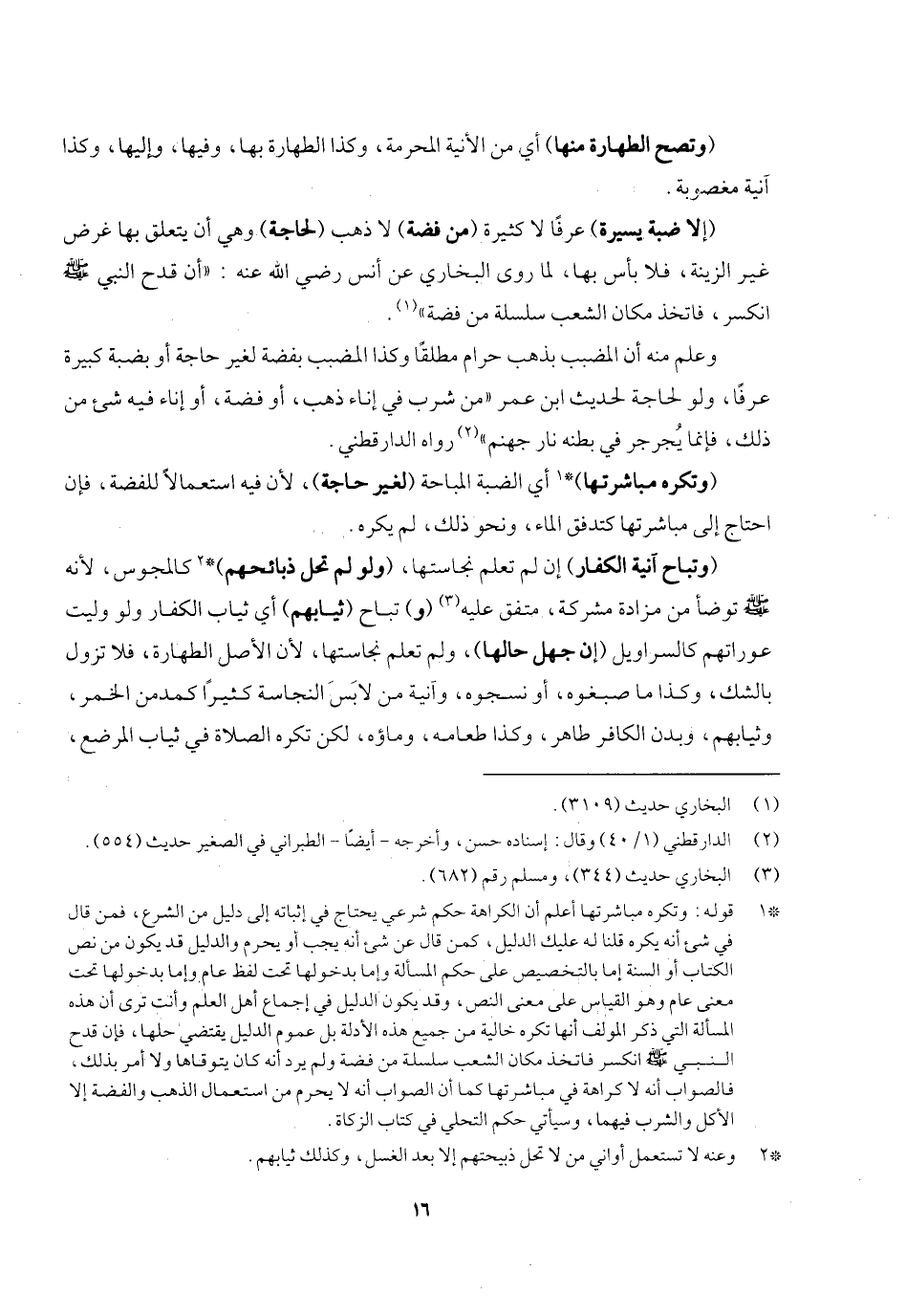 (وتصح الطهارة منها) أي من الآنية المحرمة وكذا الطهارة بها وفيها وإليها، وكذا آنية مغصوبة (إلا ضبة يسيرة) عرفا لا كبيرة (من فضة) لا ذهب (لحاجة) وهي أن يتعلق بها غرض غير الزينة فلا بأس بها، لما روى البخاري عن أنس - رَضِيَ اللَّهُ عَنْهُ -: «أن قدح النبي