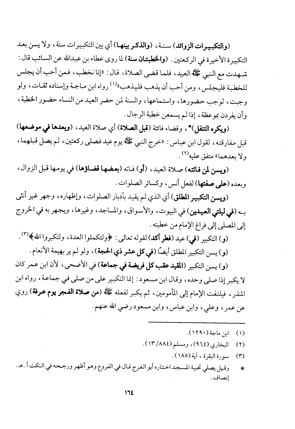 (والتكبيرات الزوائد) سنة (والذكر بينها) أي بين التكبيرات سنة، ولا يسن بعد التكبيرة الأخيرة في الركعتين (والخطبتان سنة) لما روى عطاء عن عبد الله بن السائب قال: «شهدت مع النبي - صَلَّى اللَّهُ عَلَيْهِ وَسَلَّمَ - العيد فلما قضى الصلاة قال: إنا نخطب فمن أحب أن يجلس للخطبة فليجلس، ومن أحب أن يذهب فليذهب» رواه ابن ماجه وإسناده ثقات، ولو وجبت لوجب حضورها واستماعها، والسنة لمن حضر العيد من النساء حضور الخطبة، وأن ينفردن بموعظة إذا لم يسمعن خطبة الرجال، (ويكره التنفل) وقضاء فائتة (قبل الصلاة) أي صلاة العيد (وبعدها في موضعها) قبل مفارقته لقول ابن عباس: «خرج النبي - صَلَّى اللَّهُ عَلَيْهِ وَسَلَّمَ - يوم العيد فصلى ركعتين لم يصل قبلهما، ولا بعدهما» متفق عليه.