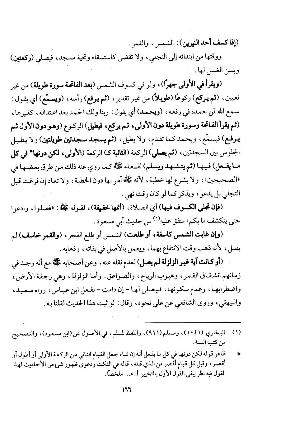 (إذا كسف أحد النيرين) الشمس والقمر ووقتها من ابتدائه إلى التجلي، ولا تقضى كاستسقاء وتحية مسجد فيصلي (ركعتين) ويسن الغسل لها.