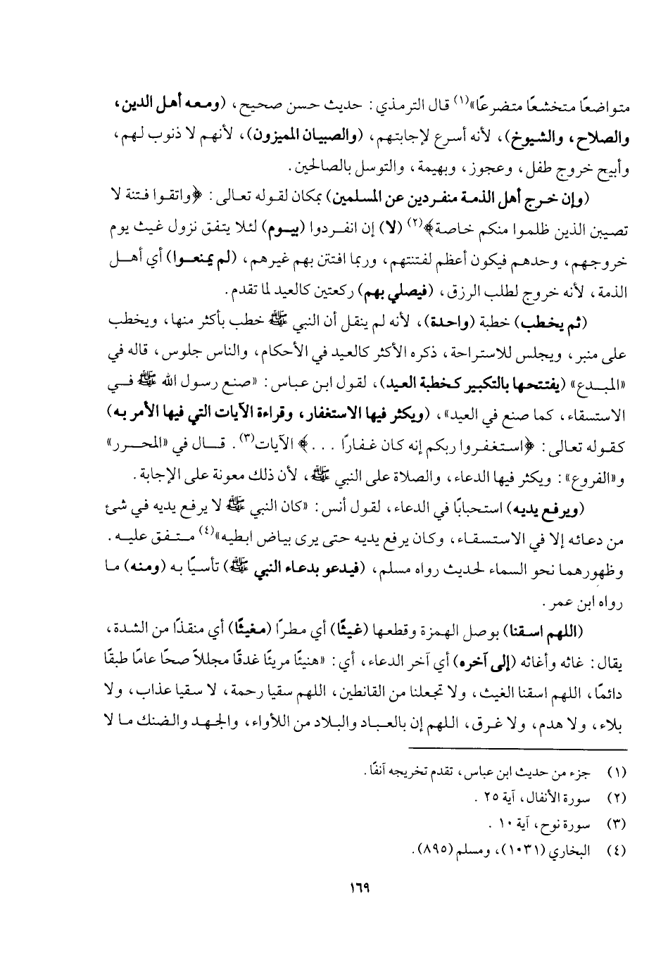 متواضعا متخشعا متضرعا» قال الترمذي: حديث حسن صحيح، (ومعه أهل الدين والصلاح والشيوخ) لأنه أسرع لإجابتهم (والصبيان المميزون) لأنهم لا ذنوب لهم، وأبيح خروج طفل وعجوز وبهيمة والتوسل بالصالحين، (وإن خرج أهل الذمة منفردين عن المسلمين) بمكان لِقَوْلِهِ تَعَالَى: {وَاتَّقُوا فِتْنَةً لا تُصِيبَنَّ الَّذِينَ ظَلَمُوا مِنْكُمْ خَاصَّةً} [الأنفال: ٢٥] (لا) إن انفردوا (بيوم) لئلا يتفق نزول غيث يوم خروجهم وحدهم فيكون أعظم لفتنتهم وربما افتتن بهم غيرهم، (لم يمنعوا) أي أهل الذمة لأنه خروج لطلب الرزق (فيصلي بهم) ركعتين كالعيد لما تقدم.