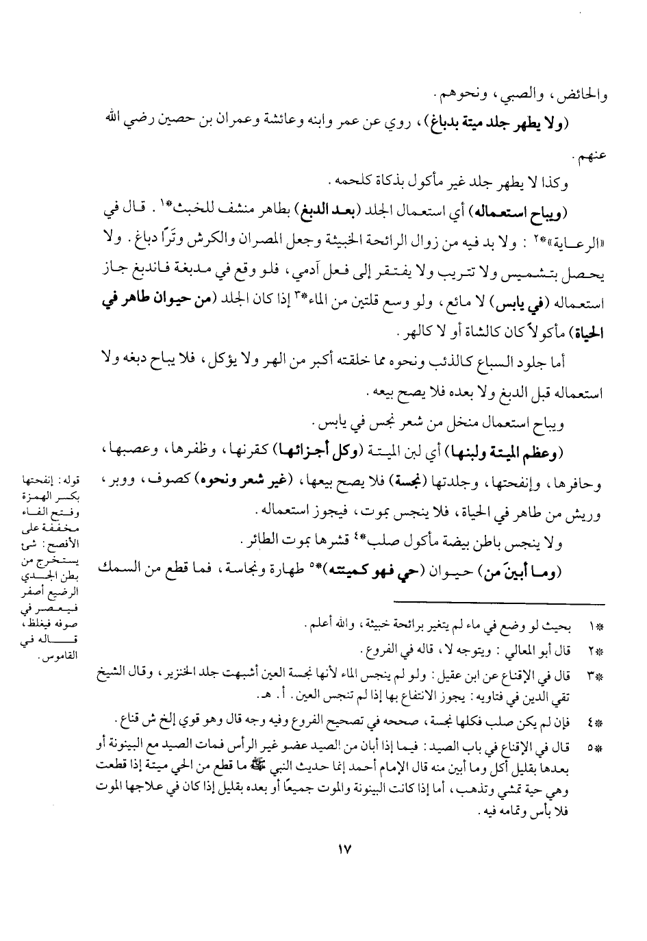 يصح بيعها (غير شعر ونحوه) كصوف ووبر وريش من طاهر في الحياة فلا ينجس بموت فيجوز استعماله. ولا ينجس باطن بيضة مأكول صلب قشرها بموت الطائر (وما أبين من) حيوان (حي فهو كميتته) طهارة ونجاسة فما قطع من السمك