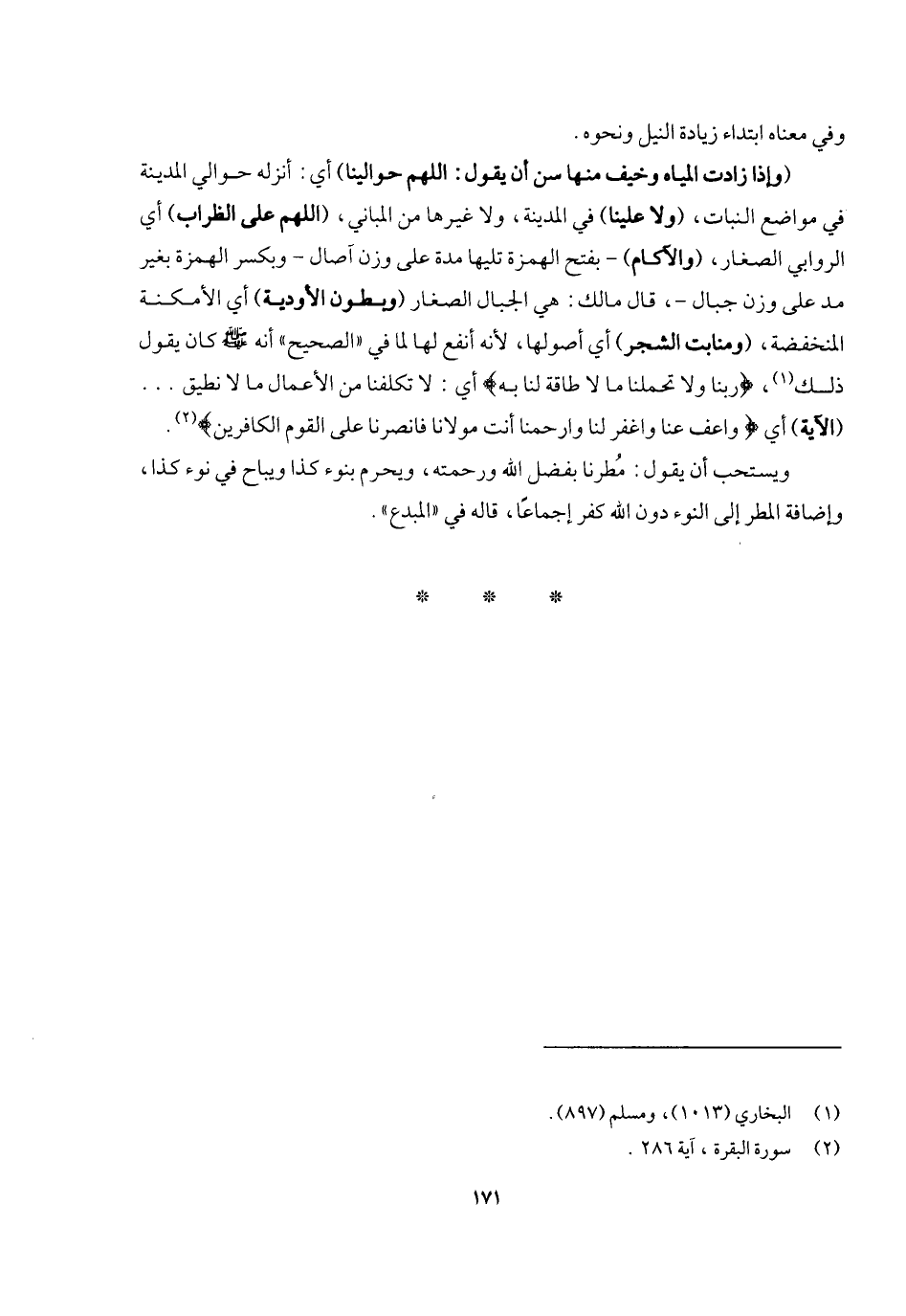 أنه - صَلَّى اللَّهُ عَلَيْهِ وَسَلَّمَ - كان يقول ذلك، {رَبَّنَا وَلا تُحَمِّلْنَا مَا لا طَاقَةَ لَنَا بِهِ} [البقرة: ٢٨٦] أي: لا تكلفنا من الأعمال ما لا نطيق ... (الآية) أي: {وَاعْفُ عَنَّا وَاغْفِرْ لَنَا وَارْحَمْنَا أَنْتَ مَوْلانَا فَانْصُرْنَا عَلَى الْقَوْمِ الْكَافِرِينَ} [البقرة: ٢٨٦] ويستحب أن يقول: مطرنا بفضل الله ورحمته، ويحرم بنوء كذا ويباح في نواء كذا، وإضافة المطر إلى النواء دون الله كفر إجماعا، قاله في " المبدع ".