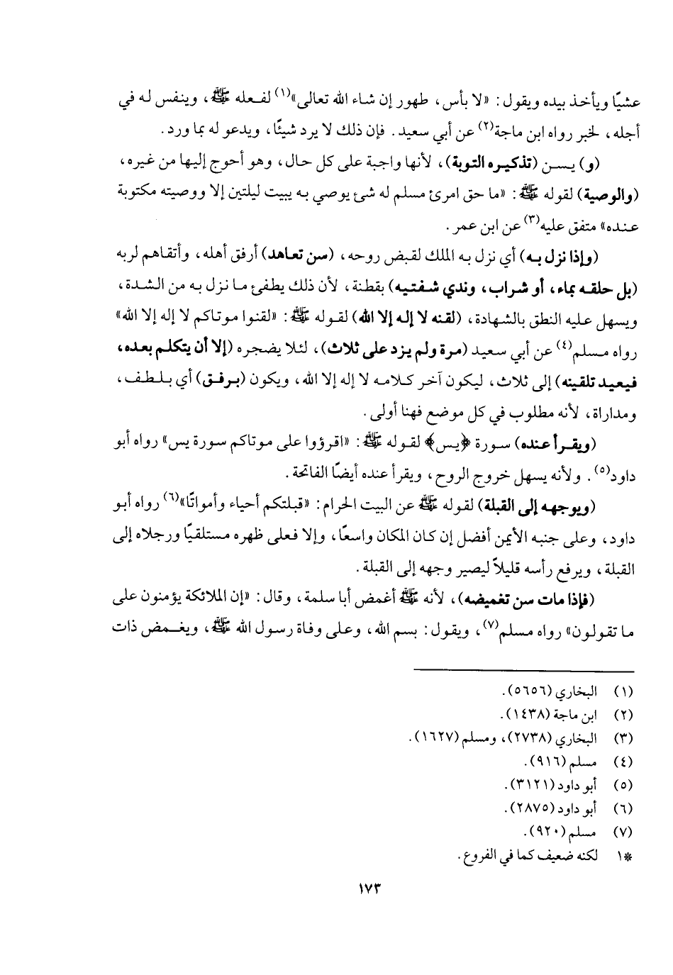 عشيا ويأخذ بيده ويقول: «لا بأس، طهورا إن شاء الله تعالى» لفعله - صَلَّى اللَّهُ عَلَيْهِ وَسَلَّمَ - وينفس له في أجله، لخبر رواه ابن ماجه عن أبي سعيد. فإن ذلك لا يرد شيئا ويدعو له بما ورد. (و) يسن (تذكيره التوبة) لأنها واجبة على كل حال وهو أحوج إليها من غيره (والوصية) لقوله - صَلَّى اللَّهُ عَلَيْهِ وَسَلَّمَ -: «ما حق امرئ مسلم له شيء يوصي به يبيت ليلتين إلا ووصيته مكتوبة عنده» متفق عليه عن ابن عمر. (وإذا نزل به) أي نزل به الملك لقبض روحه (سن تعاهد) أرفق أهله وأتقاهم لربه (ببل حلقه بماء أو شراب وتندى شفتيه) بقطنة لأن ذلك يطفئ ما نزل به من الشدة وتسهل عليه النطق بالشهادة، (وتلقينه لا إله إلا الله) لقوله - صَلَّى اللَّهُ عَلَيْهِ وَسَلَّمَ -: «لقنوا موتاكم لا إله إلا الله» رواه