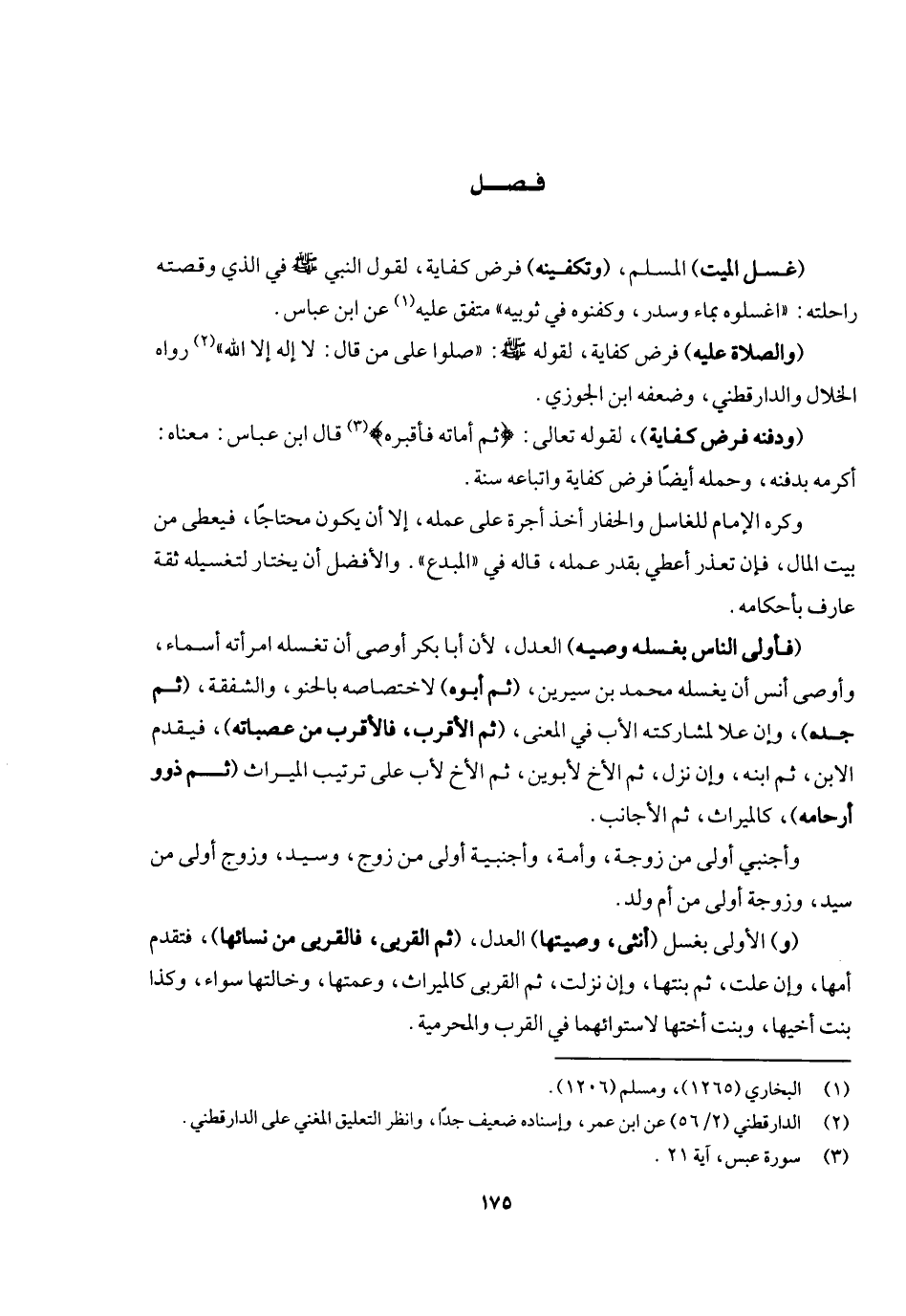فصل (غسل الميت) المسلم (وتكفينه) فرض كفاية لقول النبي - صَلَّى اللَّهُ عَلَيْهِ وَسَلَّمَ - في الذي وقصته راحلته: «اغسلوه بماء وسدر وكفنوه في ثوبيه» متفق عليه عن ابن عباس، (والصلاة عليه) فرض كفاية لقوله - صَلَّى اللَّهُ عَلَيْهِ وَسَلَّمَ -: «صلوا على من قال: لا إله إلا الله» رواه الخلال والدارقطني وضعفه ابن الجوزي، (ودفنه فرض كفاية) لِقَوْلِهِ تَعَالَى: {ثُمَّ أَمَاتَهُ فَأَقْبَرَهُ} [عبس: ٢١] قال ابن عباس: معناه: أكرمه بدفنه، وحمله أيضا فرض كفاية واتباعه سنة. وكره الإمام للغاسل والحفار أخذ أجرة على عمله إلا أن يكون محتاجا فيعطى من بيت المال، فإن تعذر أعطي بقدر عمله، قاله في " المبدع ". والأفضل أن يختار لتغسيله ثقة عارف بأحكامه (وأولى الناس بغسله وصيه) العدل لأن أبا بكر أوصى أن تغسله امرأته أسماء، وأوصى أنس أن يغسله محمد بن سيرين (ثم أبوه) لاختصاصه بالحنو والشفقة (ثم جده) وإن علا لمشاركته الأب في المعنى (ثم الأقرب فالأقرب من عصباته) فيقدم الابن ثم ابنه وإن نزل، ثم الأخ لأبوين ثم الأخ للأب على ترتيب الميراث (ثم ذوو أرحامه) كالميراث ثم الأجانب. وأجنبي أولى من زوجة
