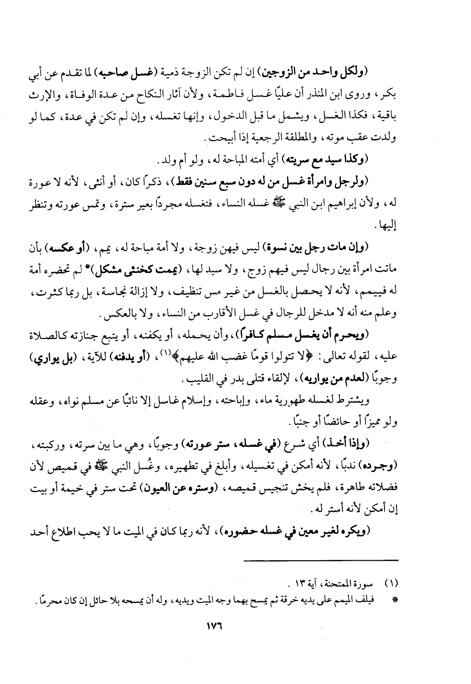 (ويحرم أن يغسل مسلم كافرا) أو أن يحمله أو يكفنه أو يتبع جنازته كالصلاة عليه لقول تعالى: {لا تَتَوَلَّوْا قَوْمًا غَضِبَ اللَّهُ عَلَيْهِمْ} [الممتحنة: ١٣] (أو يدفنه) للآية (بل يواريه) وجوبا (لعدم من يواريه) لإلقاء قتلى بدر في القليب، ويشترط لغسله طهورية ماء وإباحته وإسلام غاسل إلا نائبا عن مسلم نواه وعقله ولو مميزا أو حائضا أو جنبا.