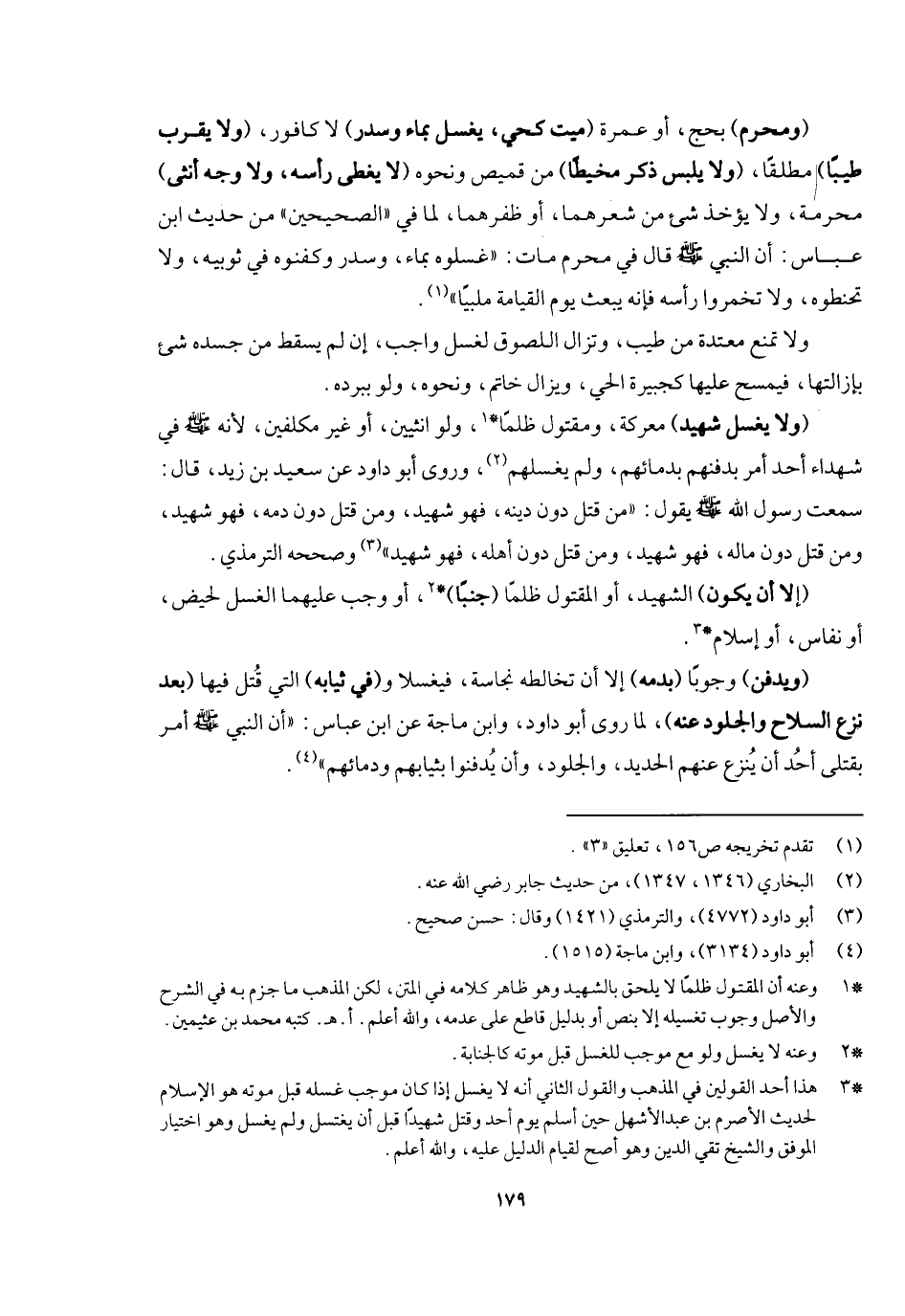 (ولا يغسل شهيد معركة) ومقتول ظلما ولو أنثيين أو غير مكلفين؛ لأنه - صَلَّى اللَّهُ عَلَيْهِ وَسَلَّمَ - في شهداء أحد أمر بدفنهم بدمائهم ولم يغسلهم، وروى أبو داود عن سعيد بن زيد قال: سمعت رسول الله - صَلَّى اللَّهُ عَلَيْهِ وَسَلَّمَ - يقول: «من قتل دون دينه فهو شهيد، ومن قتل دون دمه فهو شهيد، ومن قتل دون ماله فهو شهيد، ومن قتل دون أهله فهو شهيد» وصححه الترمذي. (إلا أن يكون) الشهيد أو المقتول ظلما (جنبا) أو وجب عليهما الغسل لحيض أو نفاس أو إسلام، (ويدفن) وجوبا (بدمه) إلا أن تخالطه نجاسة فيغسلا و (في ثيابه) التي قتل فيها (بعد نزع السلاح والجلود عنه) لما روى أبو داود وابن ماجه عن ابن عباس: «أن النبي - صَلَّى اللَّهُ عَلَيْهِ وَسَلَّمَ - أمر بقتلى أحد أن ينزع عنهم الحديد والجلود، وأن يدفنوا في ثيابهم بدمائهم» .