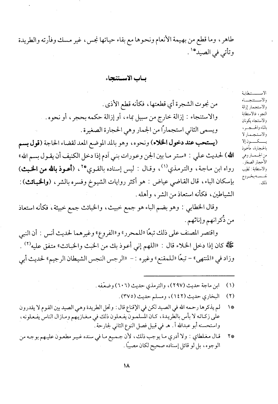 من نجوت الشجرة أي قطعتها، فكأنه قطع الأذى. والاستنجاء: إزالة خارج من سبيل بماء أو إزالة حكمه بحجر أو نحوه، ويسمى الثاني استجمارا من الجمار وهي الحجارة الصغيرة. (يستحب عند دخول الخلاء) ونحوه، وهو بالمد الموضع المعد لقضاء الحاجة (قول بسم الله) لحديث على: «ستر ما بين الجن وعورات بني آدم إذا دخل الكنيف أن يقول: بسم الله» رواه ابن ماجه والترمذي، وقال: ليس إسناده بالقوي، (أعوذ بالله من الخبث) بإسكان الباء، قال القاضي عياض: وهو أكثر روايات الشيوخ وفسره بالشر، (والخبائث) الشياطين فكأنه استعاذ من الشر وأهله، قال الخطابي: وهو بضم الباء وهو جمع خبيث والخبائث جمع خبيثة، فكأنه استعاذ من ذكرانهم وإناثهم، واقتصر المصنف على ذلك تبعا " للمحرر " و " الفروع " وغيرهما لحديث أنس: «أن النبي - صَلَّى اللَّهُ عَلَيْهِ وَسَلَّمَ - كان إذا دخل الخلاء قال: " اللهم إني أعوذ بك من الخبث والخبائث» متفق عليه. وزاد في " الإقناع " و " المنتهى " تبعا " للمقنع " وغيره " الرجس النجس الشيطان الرجيم " لحديث أبي