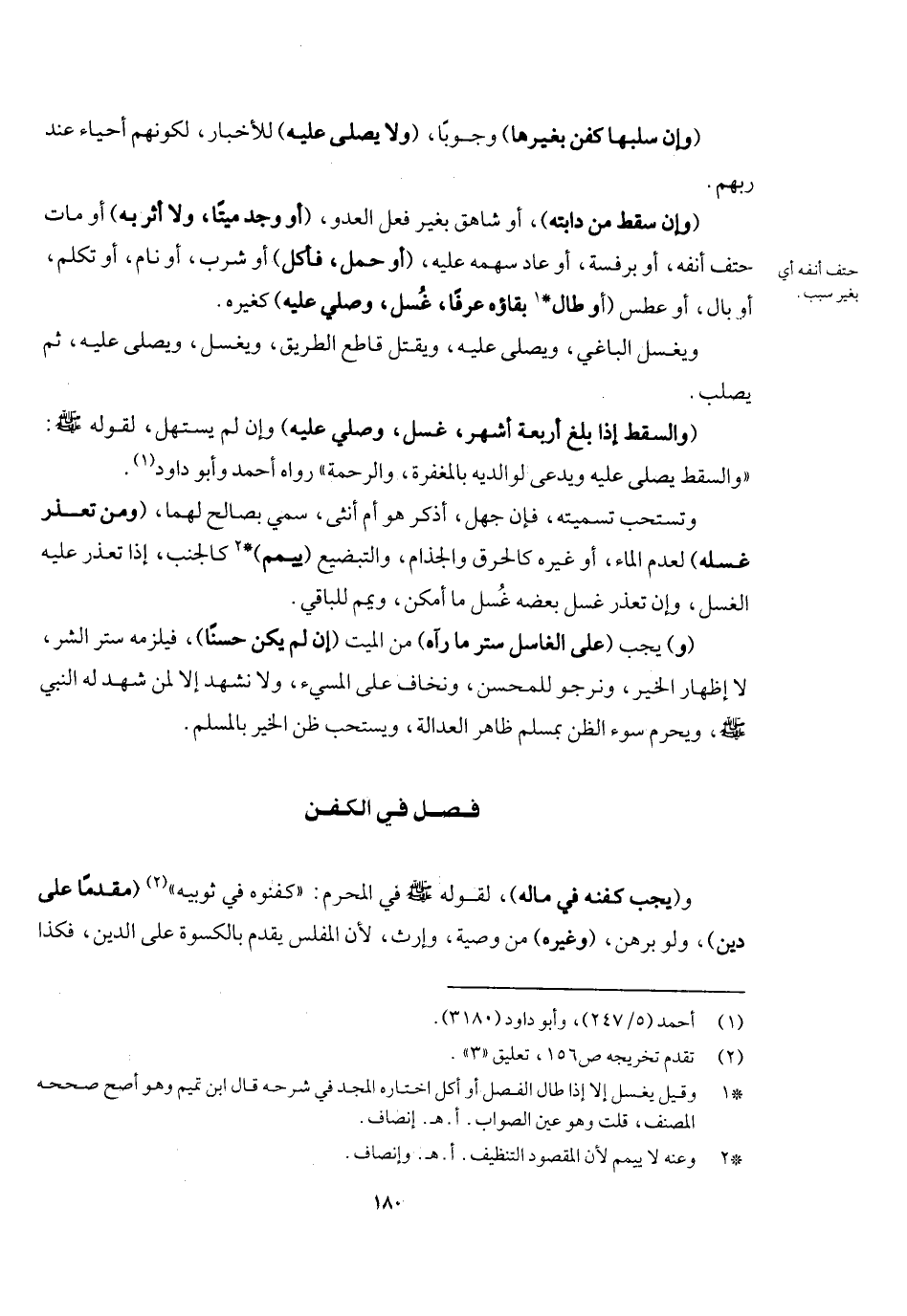 (والسقط إذا بلغ أربعة أشهر غسل وصلي عليه) وإن لم يستهل لقوله - صَلَّى اللَّهُ عَلَيْهِ وَسَلَّمَ - «والسقط يصلى عليه ويدعى لوالديه بالمغفرة والرحمة» رواه أحمد وأبو داود، وتستحب تسميته، فإن جهل أذكر هو أم أنثى سمي بصالح لهما، (ومن تعذر غسله) لعدم الماء أو غيره كالحرق والجذام والتبضيع (يمم) كالجنب إذا تعذر عليه الغسل، وإن تعذر غسل بعضه ما أمكن ويمم للباقي (و) يجب (على الغاسل ستر ما رآه) من الميت (إن لم يكن حسنا) فيلزمه ستر الشر لا إظهار الخير، ونرجو للمحسن ونخاف على المسيء، ولا نشهد إلا لمن شهد له النبي - صَلَّى اللَّهُ عَلَيْهِ وَسَلَّمَ -، ويحرم سوء الظن بمسلم ظاهر العدالة، ويستحب ظن الخير بالمسلم.