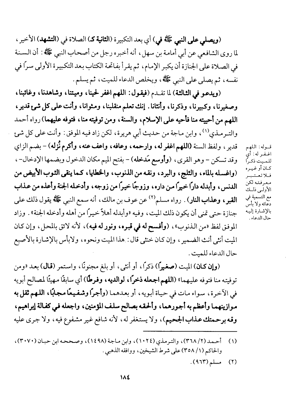 (ويدعو في الثالثة) لما تقدم (فيقول: «اللهم اغفر لحينا وميتنا وشاهدنا وغائبنا وصغيرنا وكبيرنا وذكرنا وأنثانا. إنك تعلم منقلبنا ومثوانا وأنت على كل شيء قدير، اللهم من أحييته منا فأحيه على الإسلام والسنة، ومن توفيته منا فتوفه عليهما» رواه أحمد والترمذي وابن ماجه من حديث أبي هريرة لكن زاد فيه الموفق: «وأنت على كل شيء قدير» ، ولفظ السنة «اللهم اغفر له وارحمه وعافه واعف عنه وأكرم نزله» بضم الزاي وقد تسكن وهو القرى «ووسع مدخله» بفتح: الميم مكان الدخول وبضمها الإدخال، «واغسله بالماء والثلج والبرد ونقه من الذنوب والخطايا كما ينقى الثوب الأبيض من الدنس، وأبدله دارا خيرا من داره وزوجا خيرا من زوجه، وأدخله الجنة وأعذه من عذاب القبر وعذاب النار» رواه مسلم عن عوف بن مالك أنه سمع النبي - صَلَّى اللَّهُ عَلَيْهِ وَسَلَّمَ - يقول ذلك على جنازة حتى تمنى أن يكون ذلك الميت، وفيه «وأبدله أهلا خيرا من أهله وأدخله الجنة» . وزاد الموفق لفظ " من الذنوب " (وافسح له في قبره ونور له فيه) لأنه لائق بالمحل، وإن كان الميت أنثى أنث الضمير، وإن كان خنثى قال: هذا الميت ونحوه، ولا بأس بالإشارة بالأصبع حال الدعاء للميت.