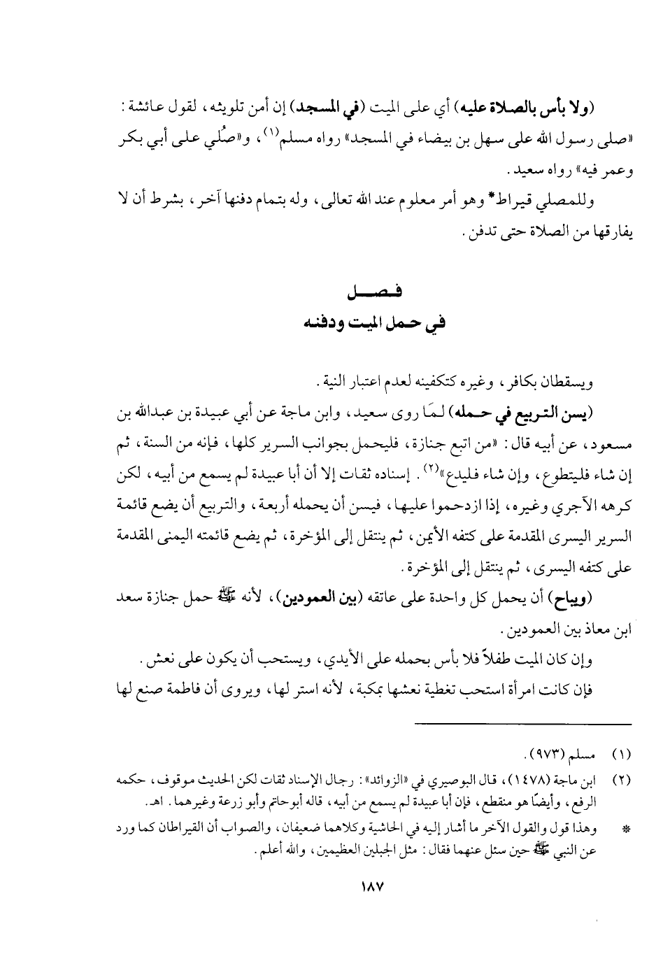 ويسقطان بكافر وغيره كتكفينه لعدم اعتبار النية. (يسن التربيع في حمله) لما روى سعيد وابن ماجه عن أبي عبيدة بن عبد الله بن مسعود عن أبيه قال: «من اتبع جنازة فليحمل بجوانب السرير كلها فإنه من السنة، ثم إن شاء فليتطوع وإن شاء فليدع» . إسناده ثقات إلا أن أبا عبيدة لم يسمع من أبيه، لكن كرهه الآجري وغيره، وإذا ازدحموا عليها فيسن أن