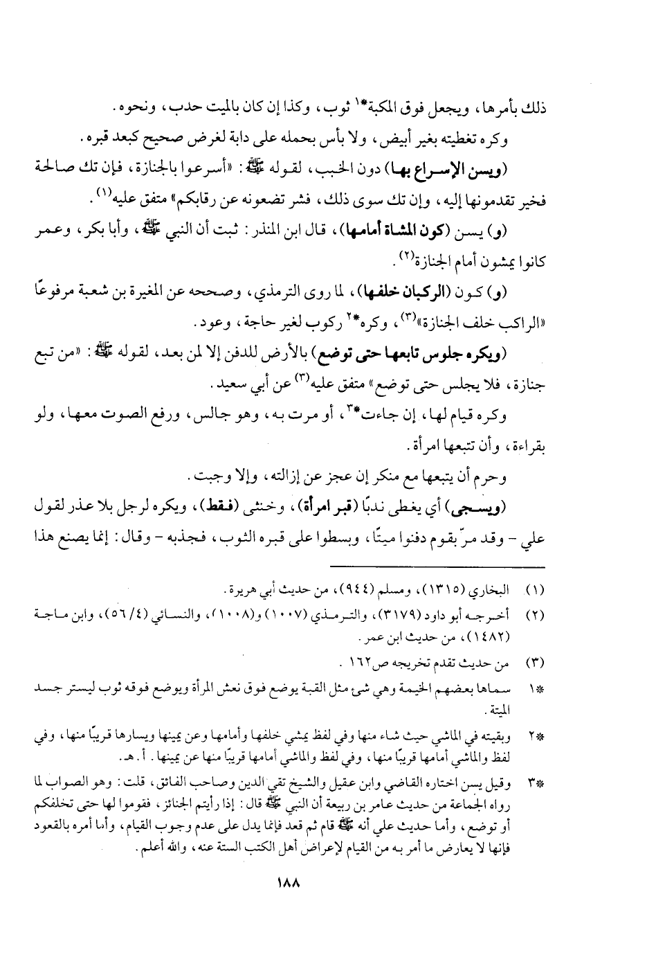(ويسن الإسراع بها) دون الخبب لقوله - صَلَّى اللَّهُ عَلَيْهِ وَسَلَّمَ -: «أسرعوا بالجنازة فإن تك صالحة فخير تقدمونها إليه، وإن تك سوءا فشر تضعونه عن رقابكم» متفق عليه. (و) يسن (كون المشاة أمامها) قال ابن المنذر: ثبت أن النبي - صَلَّى اللَّهُ عَلَيْهِ وَسَلَّمَ - وأبا بكر وعمر كانوا يمشون أمام الجنازة، (و) كون (الركبان خلفها) لما روى الترمذي وصححه عن المغيرة بن شعبة مرفوعا «الراكب خلف الجنازة» ، وكره ركوب لغير حاجة وعود، (ويكره جلوس تابعها حتى توضع) بالأرض للدفن إلا لمن بعد، لقوله - صَلَّى اللَّهُ عَلَيْهِ وَسَلَّمَ -: «من تبع جنازة فلا يجلس حتى توضع» متفق عليه عن أبي سعيد، وكره قيام لها إن جاءت أو مرت به وهو جالس ورفع الصوت معها ولو بقراءة وأن تتبعها امرأة، وحرم أن يتبعها مع منكر إن عجز عن إزالته وإلا وجبت.