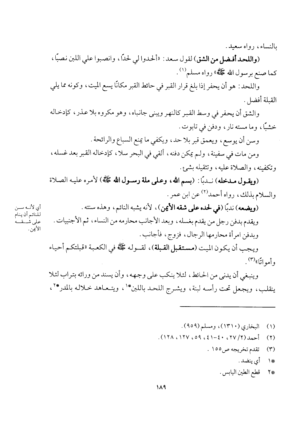 (واللحد أفضل من الشق) لقول سعد: «ألحدوا لي لحدا وانصبوا علي اللبن نصبا كما صنع برسول الله - صَلَّى اللَّهُ عَلَيْهِ وَسَلَّمَ -» رواه مسلم. واللحد: هو أن يحفر إذا بلغ قرار القبر في حائط القبر مكانا يسع الميت وكونه مما يلي القبلة أفضل، والشق أن يحفر في وسط القبر كالنهر ويبنى جانباه، وهو مكروه بلا عذر كإدخاله خشبا وما مسته نار ودفن في تابوت، وسن أن يوسع ويعمق قبر بلا حد ويكفي ما يمنع السباع والرائحة. ومن مات في سفينة ولم يمكن دفنه، ألقي في البحر سلا كإدخاله القبر بعد غسله وتكفينه والصلاة عليه وتثقيله بشيء.