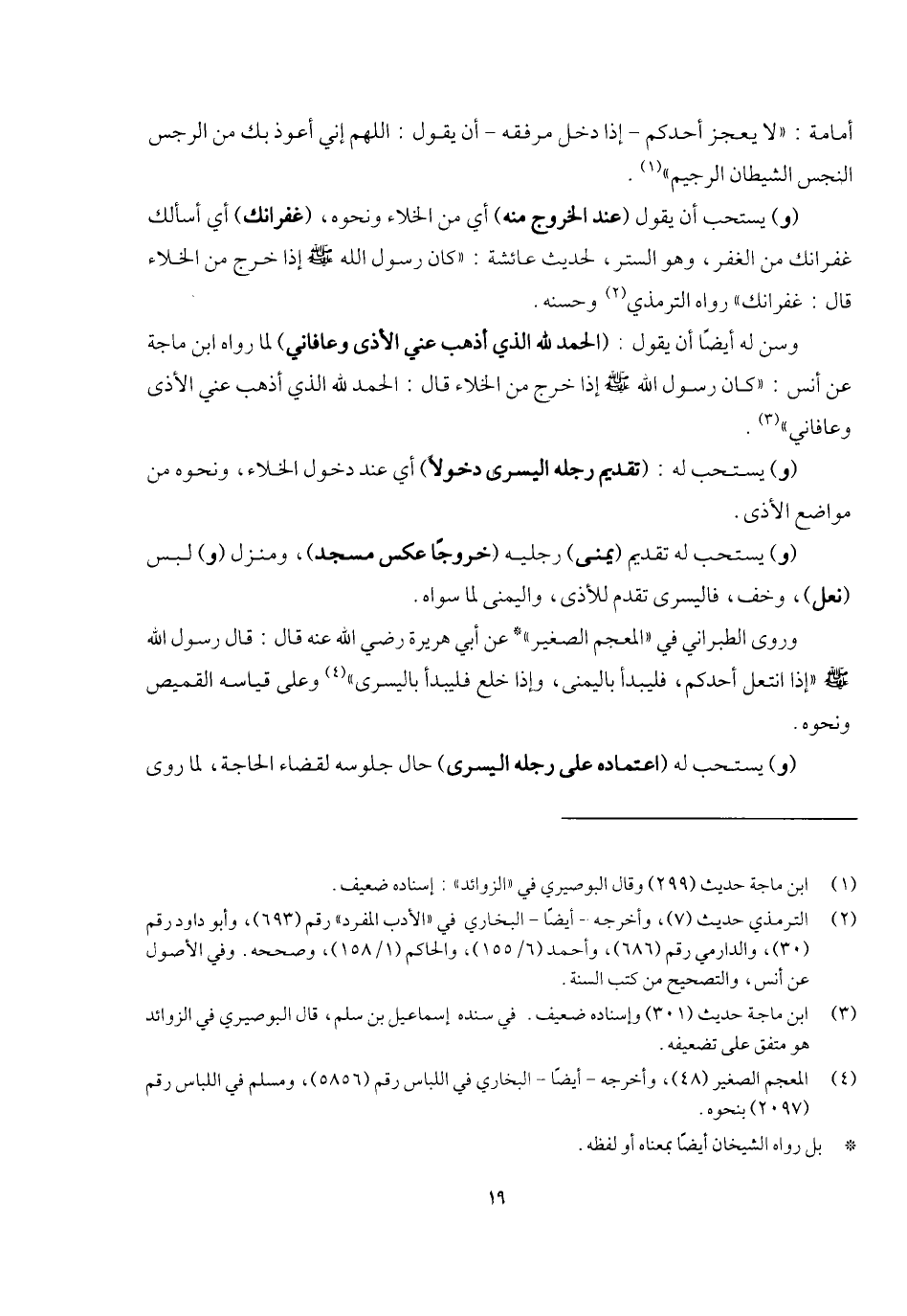 أذهب عني الأذى وعافاني) لما رواه ابن ماجه عن أنس: «كان رسول الله - صَلَّى اللَّهُ عَلَيْهِ وَسَلَّمَ - إذا خرج من الخلاء قال: الحمد لله الذي أذهب عني الأذى وعافاني» . (و) يستحب له (تقديم رجله اليسرى دخولا) أي عند دخول الخلاء ونحوه من مواضع الأذى (و) يستحب له تقديم (اليمنى) رجليه (خروجا عكس مسجد) ومنزل (و) لبس (نعل) وخف، فاليسرى تقدم للأذى واليمنى لما سواه. وروى الطبراني في " المعجم الصغير " عن أبي هريرة - رَضِيَ اللَّهُ عَنْهُ - قال: قال رسول الله - صَلَّى اللَّهُ عَلَيْهِ وَسَلَّمَ -: «إذا انتعل أحدكم فليبدأ باليمنى وإذا خلع فليبدأ باليسرى» وعلى قياسه القميص ونحوه. (و) يستحب له (اعتماده على رجله اليسرى) حال جلوسه لقضاء الحاجة، لما روى