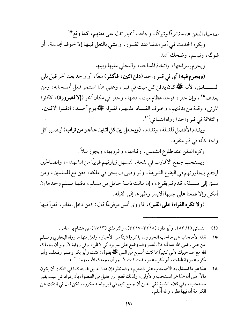 صاحباه الدفن عنده تشرفا وتبركا وجاءت أخبار تدل على دفنهم كما وقع، ويكره الحديث في أمر الدنيا عند القبور والمشي بالنعل فيها إلا خوف نجاسة أو شوك، وتبسم وضحك أشد، ويحرم إسراجها واتخاذ المساجد والتخلي عليها وبينها.