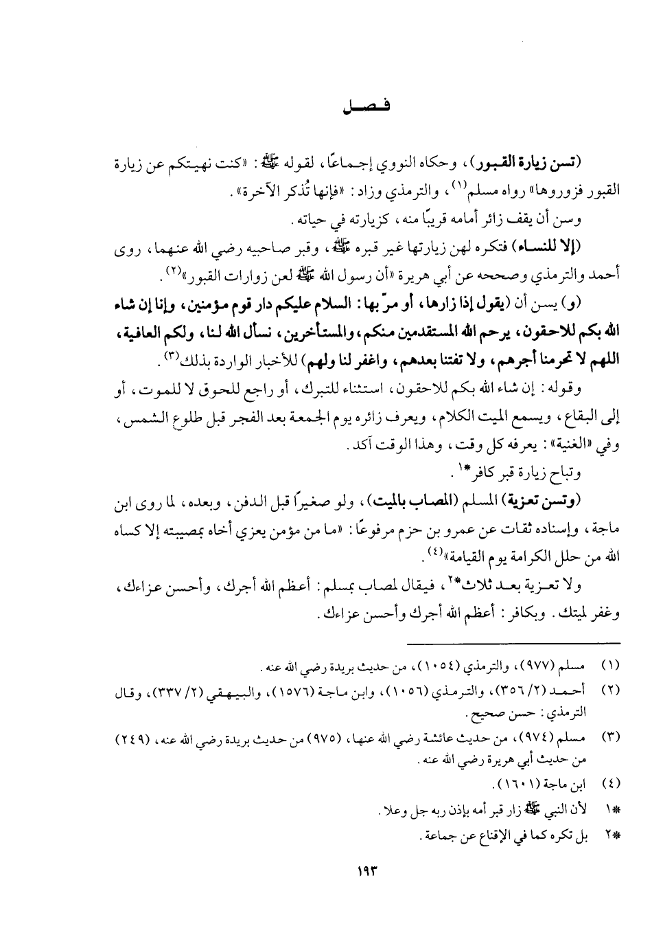 فصل (تسن زيارة القبور) وحكاه النووي إجماعا لقوله - صَلَّى اللَّهُ عَلَيْهِ وَسَلَّمَ -: «كنت نهيتكم عن زيارة القبور فزوروها» رواه مسلم والترمذي وزاد: «فإنها تذكركم الآخرة» . وسن أن يقف زائرا أمامه قريبا منه كزيارته في حياته، (إلا للنساء) فتكره لهن زيارتها غير قبره - صَلَّى اللَّهُ عَلَيْهِ وَسَلَّمَ - وقبر صاحبيه - رَضِيَ اللَّهُ عَنْهُمَا -، روى أحمد والترمذي وصححه عن أبي هريرة «أن رسول الله - صَلَّى اللَّهُ عَلَيْهِ وَسَلَّمَ - لعن زوارات القبور» .