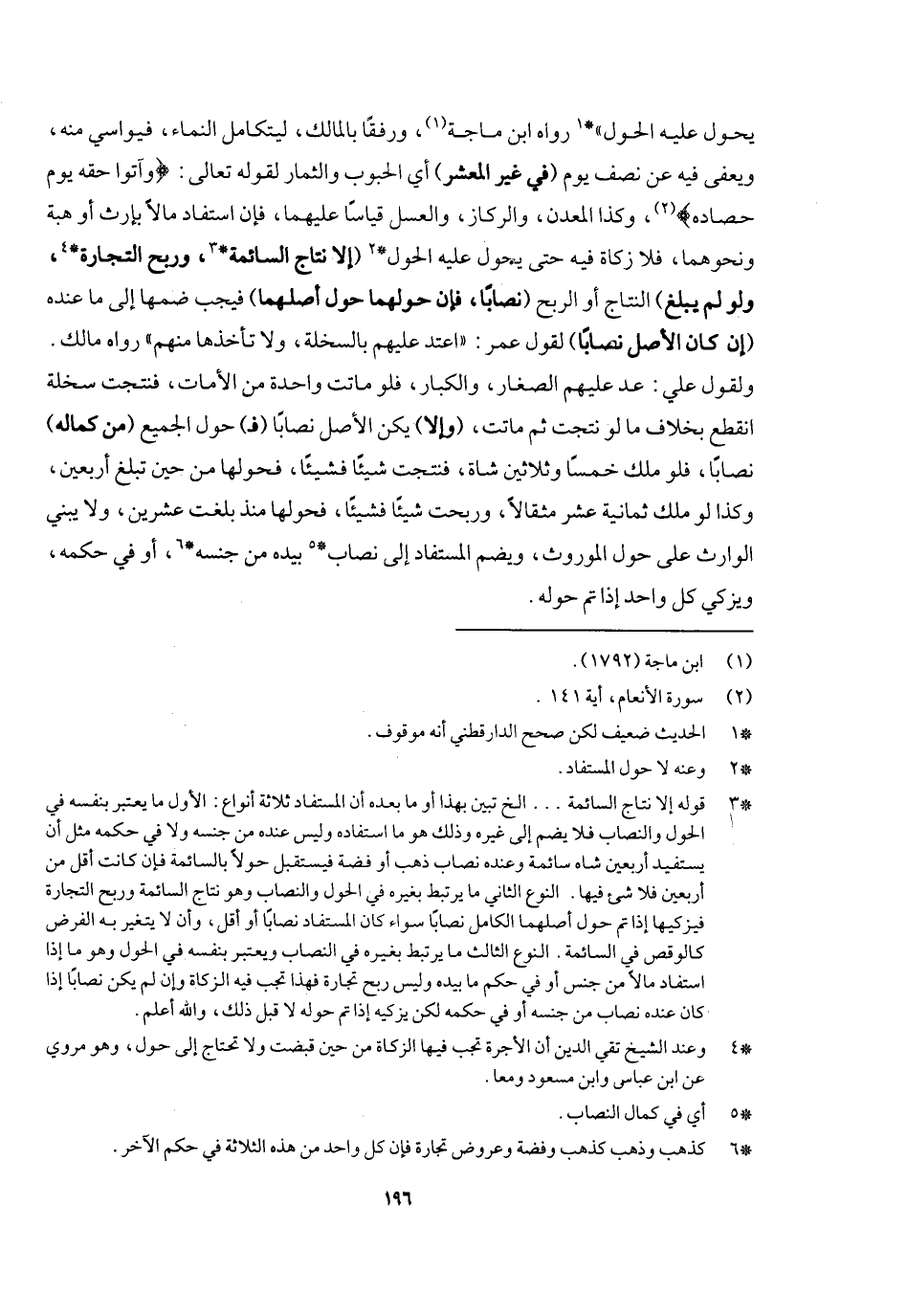 يحول عليه الحول» رواه ابن ماجه، ورفقا بالملك ليتكامل النماء فيواسي منه، ويعفى فيه عن نصف يوم (في غير المعشر) أي الحبوب والثمار لِقَوْلِهِ تَعَالَى: {وَآتُوا حَقَّهُ يَوْمَ حَصَادِهِ} [الأنعام: ١٤١] ، وكذا المعدن والركاز والعسل قياسا عليهما، فإن استفاد مالا بإرث أو هبة ونحوهما فلا زكاة فيه حتى يحول عليه الحول (إلا نتاج السائمة وربح التجارة، ولو لم يبلغ)