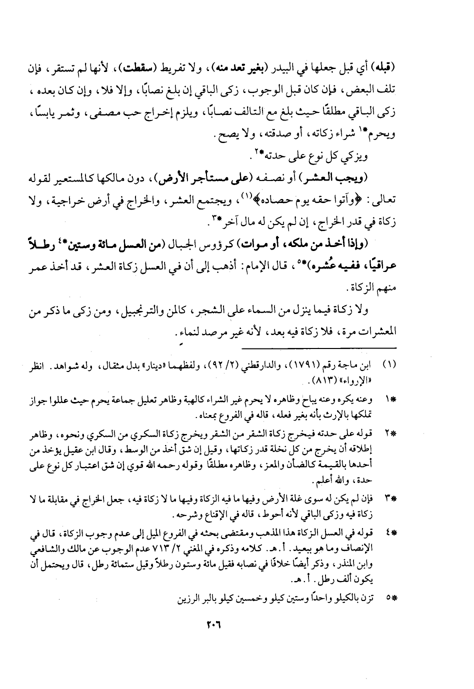 (ويجب العشر) أو نصفه (على مستأجر الأرض) دون مالكها كالمستعير لِقَوْلِهِ تَعَالَى: {وَآتُوا حَقَّهُ يَوْمَ حَصَادِهِ} [الأنعام: ١٤١] ويجتمع العشر والخراج في أرض خراجية، ولا زكاة في قدر الخراج إن لم يكن له مال آخر، (وإذا أخذ من ملكه أو موات) كرؤوس الجبال (من العسل مائة وستين رطلا عراقيا ففيه عشره) ، قال الإمام: أذهب إلى أن في العسل زكاة العشر قد أخذ عمر منهم الزكاة، ولا زكاة فيما ينزل من السماء على الشجر كالمن والزنجبيل، وإن زكى ما ذكر من المعشرات مرة فلا زكاة فيه بعد؛ لأنه غير مرصد للنماء،