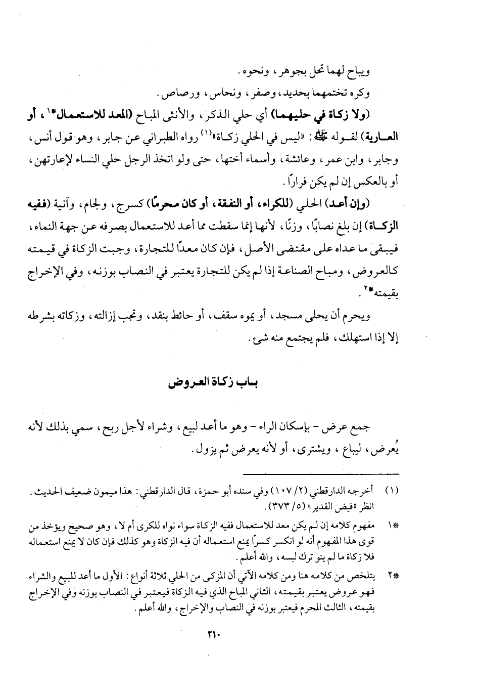 ويباح لهما تحل بجوهر ونحوه، وكره تختمهما بحديد وصفر ونحاس ورصاص (ولا زكاة في حليهما) أي حلي الذكر والأنثى المباح (المعد للاستعمال أو العارية) لقوله - صَلَّى اللَّهُ عَلَيْهِ وَسَلَّمَ -: «ليس في الحلي زكاة» رواه الطبراني عن جابر وهو قول أنس وجابر، وابن عمر وعائشة وأسماء أختها، حتى ولو اتخذ الرجل حلي النساء لإعارتهن أو بالعكس إن لم يكن فرارا، (وإن أعد) الحلي (للكراء أو النفقة أو كان محرما) كسرج ولجام وآنية (ففيه الزكاة) إن بلغ نصابا وزنا؛ لأنها إنما سقطت مما أعد للاستعمال بصرفه عن جهة النماء، فيبقى ما عداه على مقتضى الأصل، فإن كان معدا للتجارة وجبت الزكاة في قيمته كالعروض ومباح الصناعة إن لم يكن للتجارة يعتبر في النصاب بوزنه، وفي الإخراج بقيمته. ويحرم أن يحلى مسجد أو يموه سقف أو حائط بنقد، وتجب إزالته وزكاته بشرطه إلا إذا استهلك فلم يجتمع منه شيء.