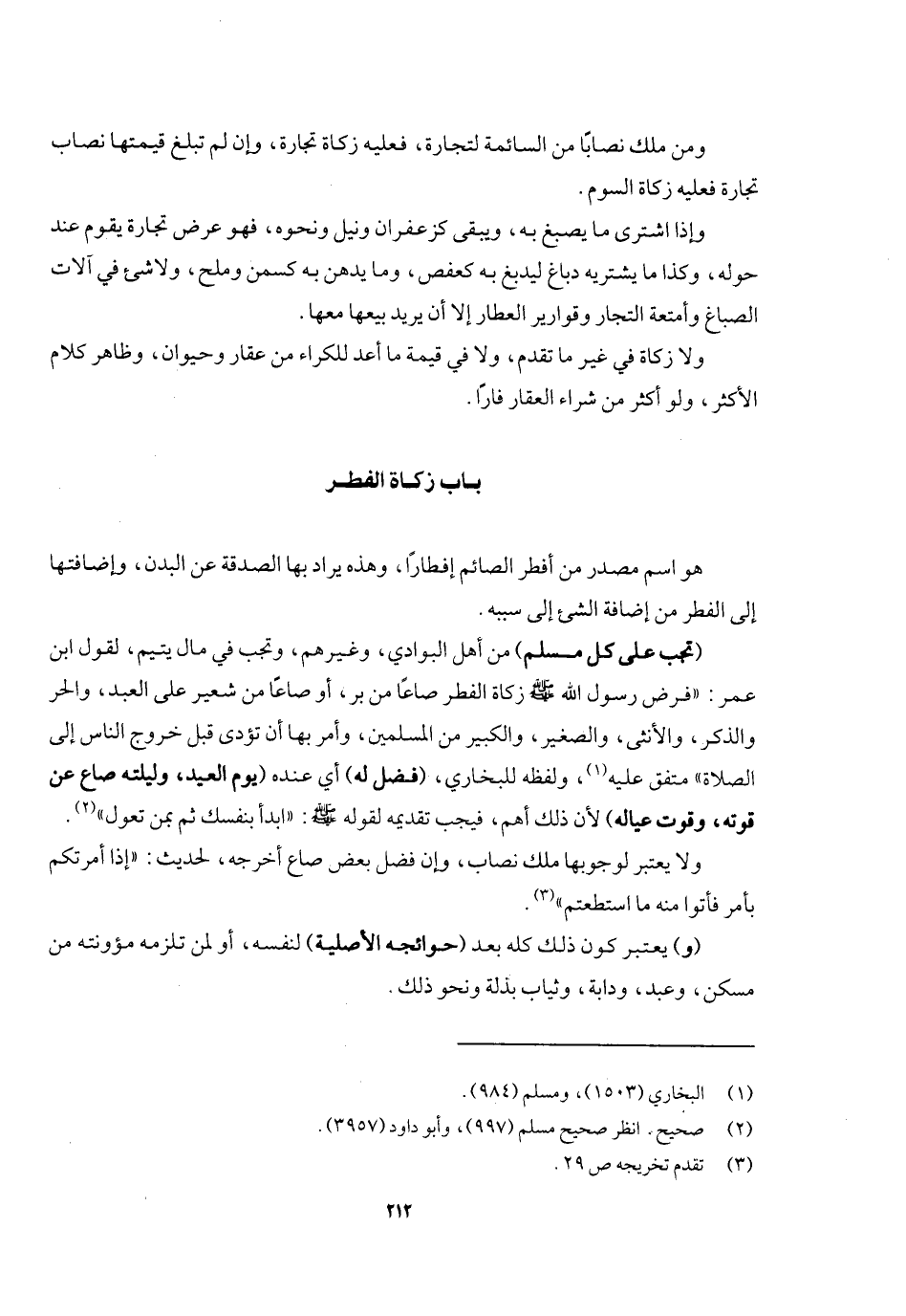 (وتجب على كل مسلم) من أهل البوادي وغيرهم، وتجب في مال يتيم لقول ابن عمر: «فرض رسول الله - صَلَّى اللَّهُ عَلَيْهِ وَسَلَّمَ - زكاة الفطر صاعا من بر أو صاعا من شعير على العبد والحر والذكر والأنثى والصغير والكبير من المسلمين، وأمر بها أن تؤدى قبل خروج الناس إلى الصلاة» متفق عليه، ولفظه للبخاري، (فضل له) أي عنده (يوم العيد وليلته صاع عن قوته وقوت عياله) لأن ذلك أهم فيجب تقديمه لقوله - صَلَّى اللَّهُ عَلَيْهِ وَسَلَّمَ -: «ابدأ بنفسك ثم بمن تعول» ولا يعتبر لوجوبها ملك نصاب، وإن فضل بعض صاع أخرجه لحديث: «إذا أمرتكم بأمر