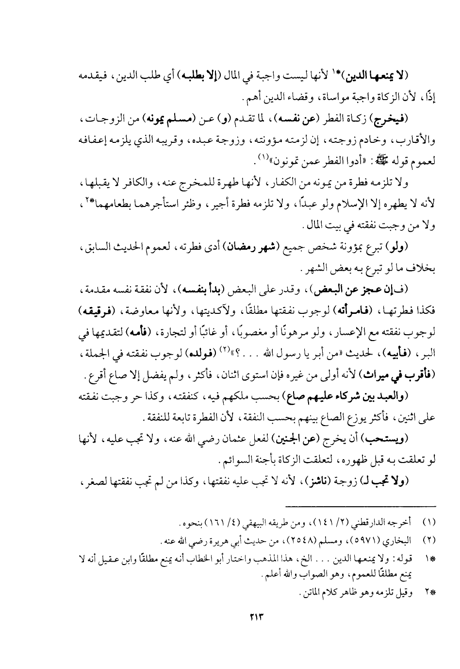 (لا يمنعها الدين) لأنها ليست واجبة في المال (إلا بطلبه) أي طلب الدين فيقدمه إذا لأن الزكاة واجبة مواساة، وقضاء الدين أهم.
