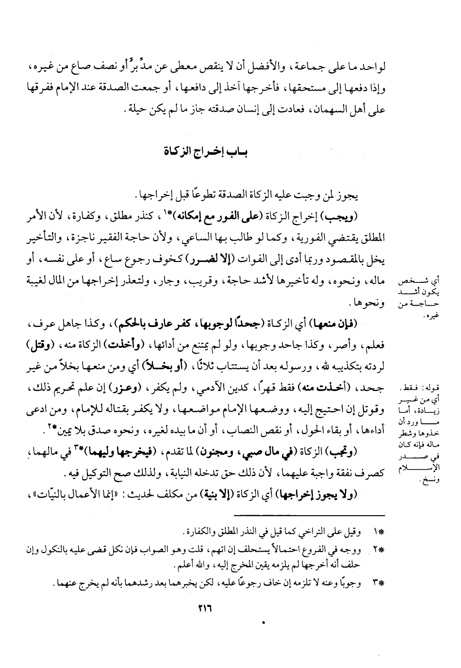 (ويجب) إخراج (الزكاة على الفور مع إمكانه) كنذر مطلق وكفارة؛ لأن الأمر المطلق يقتضي الفورية، وكما لو طالب بها الساعي؛ ولأن حاجة الفقير ناجزة والتأخير مخل بالمقصود وربما أدى إلى الفوات (إلا الضرر) كخوف رجوع ساع على نفسه أو ماله ونحوه، وله تأخيرها لأشد حاجة وقريب وجار، ولتعذر إخراجها من المال لغيبة ونحوها، (فإن منعها) أي الزكاة (جحدا لوجوبها كفر عارف بالحكم) وكذا جاهل عرف فعلم وأصر، وكذا جاحد وجوبها ولو لم يمتنع من أدائها (وأخذت) الزكاة منه (وقتل) لردته بتكذيبه لله ورسوله بعد أن يستتاب ثلاثا (أو بخلا) أي ومن منعها بخلا من غير جحد (أخذت منه) فقط قهرا كدين الآدمي ولم يكفر، (وعزر) إن علم تحريم ذلك، وقوتل إن احتيج إليه ووضعها الإمام مواضعها، ولا يكفر بقتاله للإمام، ومن ادعى أداءها أو بقاء الحول أو نقص النصاب أو أن ما بيده لغيره ونحوه صدق بلا يمين.