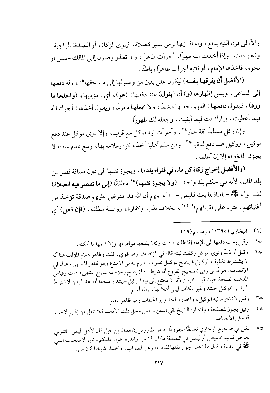(والأفضل إخراج زكاة كل مال في فقراء بلده) ويجوز نقلها إلى دون مسافة قصر من بلد المال؛ لأنه في حكم بلد واحد، (ولا يجوز نقلها) مطلقا (إلى ما تقصر فيه الصلاة) لقوله - صَلَّى اللَّهُ عَلَيْهِ وَسَلَّمَ - لمعاذ لما بعثه لليمن: «أعلمهم أن الله قد افترض عليهم صدقة تؤخذ من أغنيائهم فترد على فقرائهم» بخلاف نذر وكفارة ووصية مطلقة، (فإن فعل) أي