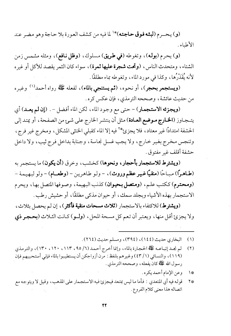 (ويشترط للاستجمار بأحجار ونحوها) كخشب وخرق (أن يكون) ما يستجمر به (طاهرا) مباحا (منقيا غير عظم وروث) ولو طاهرين (وطعام) ولو لبهيمة (ومحترم) ككتب علم (ومتصل بحيوان) كذنب البهيمة وصوفها المتصل بها، ويحرم الاستجمار بهذه الأشياء وبجلد سمك أو حيوان مذكى مطلقا أو حشيش رطب. (ويشترط) للاكتفاء بالاستجمار (ثلاث مسحات منقية فأكثر) إن لم يحصل بثلاث، ولا يجزئ أقل منها ويعتبر أن تعم كل مسحة المحل (ولو) كانت الثلاث (بحجر ذي