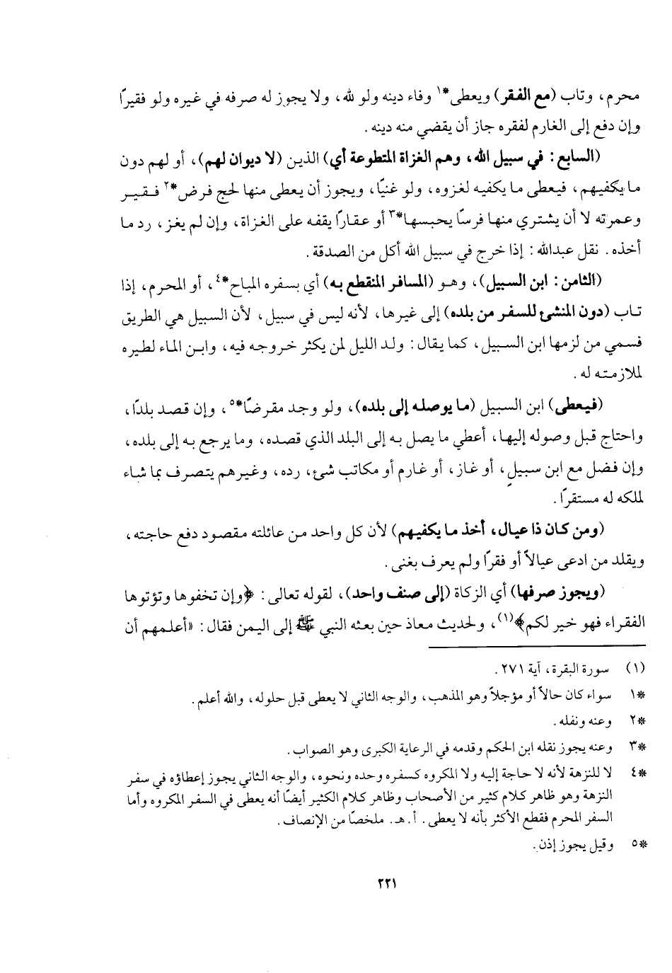 (السابع: في سبيل الله وهم الغزاة المتطوعة أي) الذين (لا ديوان لهم) أو لهم دون ما يكفيهم فيعطى ما يكفيه لغزوة ولو غنيا، ويجزئ أن يعطي منها لحج فرض فقير وعمرته لا أن يشتري منها فرسا يحبسها أو عقارا يقفه على الغزاة، وإن لم يغز رد ما أخذه. نقل عبد الله إذا خرج في سبيل الله أكل من الصدقة.