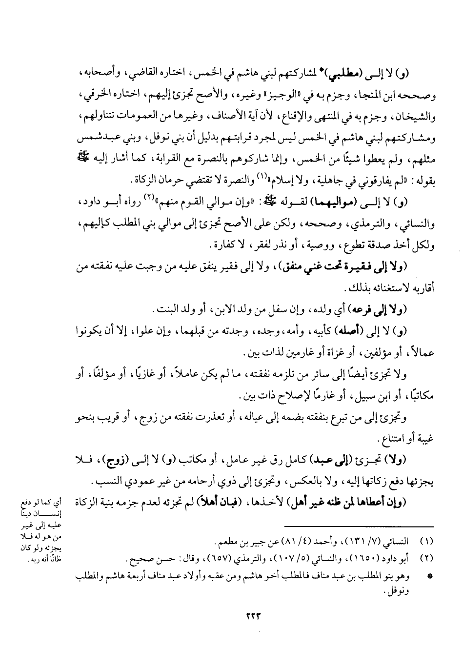 (و) لا إلى (مطلبي) لمشاركتهم لبني هاشم في الخمس، اختاره القاضي وأصحابه وصححه ابن المنجا، وجزم به في الوجيز وغيره، والأصح تجزئ إليهم اختاره الخرقي والشيخان وغيرهم؛ لأن آية الأصناف وغيرها من العمومات تتناولهم ومشاركتهم لبني هاشم في الخمس ليس لمجرد قرابتهم بدليل أن بني نوفل وبني عبد شمس مثلهم، ولم يعطوا شيئا من الخمس إنما شاركوهم بالنصرة مع القرابة، كما أشار إليه - صَلَّى اللَّهُ عَلَيْهِ وَسَلَّمَ - بقوله: «لم يفارقوني في جاهلية ولا إسلام» والنصرة لا تقتضي حرمان الزكاة (و) لا إلى (مواليهما) لقوله - صَلَّى اللَّهُ عَلَيْهِ وَسَلَّمَ -: «وإن مولى القوم منهم» رواه أبو داود والنسائي والترمذي وصححه ولكن على الأصح تجزئ إلى