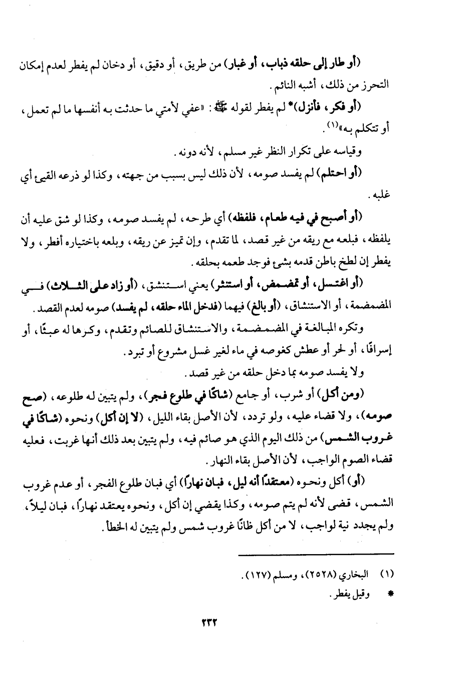 (أو طار إلى حلقه ذباب أو غبار) من طريق أو دقيق أو دخان لم يفطر لعدم إمكان التحرز من ذلك أشبه النائم، (أو فكر فأنزل) لم يفطر لقوله - صَلَّى اللَّهُ عَلَيْهِ وَسَلَّمَ -: «عفي لأمتي ما حدثت به أنفسها ما لم تعمل به أو تتكلم به» وقياسه على تكرار النظر غير مسلم؛ لأنه دونه (أو احتلم) لم يفسد صومه؛ لأن ذلك ليس بسبب من جهته وكذا لو ذرعه القيء أي غلبه (أو أصبح في فيه طعام فلفظه) أي طرحه لم يفسد صومه، وكذا لو شق عليه أن يلفظه فبلعه مع ريقه من غير قصد لم يفسد لما تقدم، وإن تميز عن ريقه وبلعه باختياره أفطر، ولا يفطر إن لطخ باطن قدميه بشيء فوجد طعمه في حلقه، (أو اغتسل أو تمضمض أو استنثر) يعني استنشق، (أو زاد على الثلاث) في المضمضة أو الإستنشاق، (أو بالغ) فيهما (فدخل الماء حلقه لم يفسد صومه) لعدم القصد، وتكره المبالغة في المضمضة والاستنشاق للصائم وتقدم، وكرها له عبثا أو إسرافا أو لحر أو عطش كغوصه في ماء لغير غسل مشروع أو تبرد، ولا يفسد صومه بما دخل حلقه من غير قصد.