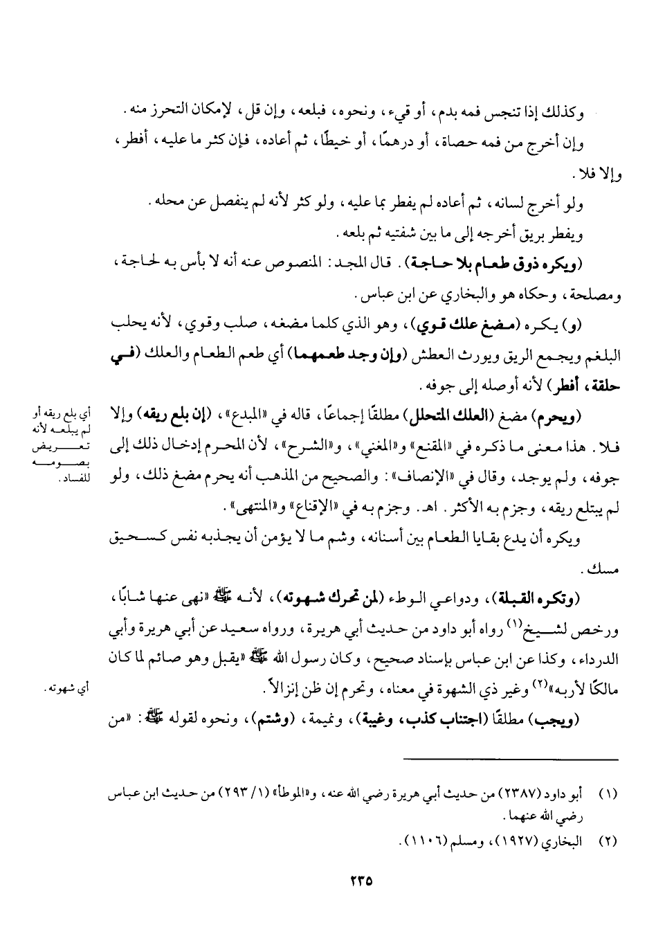 (ويحرم) مضغ (العلك المتحلل) مطلقا إجماعا قاله في " المبدع "، إن (بلع ريقه) وإلا فلا. هذا معنى ما ذكره في " المقنع "و " المغني "و " الشرح " لأن المحرم إدخال ذلك إلى جوفه ولم يوجد، وقال في " الإنصاف ": والصحيح من المذهب أنه يحرم مضغ ذلك ولو لم يبتلع ريقه، وجزم به الأكثر. اهـ. وجزم به في " الإقناع "و " المنتهى ". ويكره أن يدع بقايا الطعام بين أسنانه وشم ما لا يؤمن أن يجذبه نفسه كسحيق مسك.