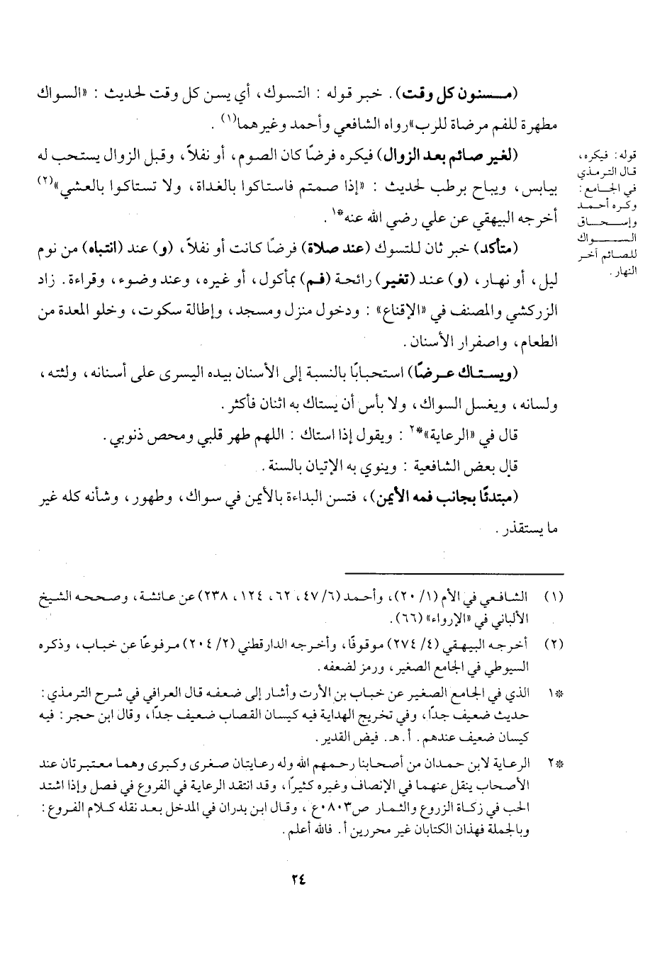 (مسنون كل وقت) . خبر قوله: التسوك، أي يسن كل وقت لحديث: «السواك مطهرة للفم مرضاة للرب» رواه الشافعي وأحمد وغيرهما (لغير صائم بعد الزوال) فيكره فرضا كان الصوم أو نفلا وقبل الزوال يستحب له بيابس ويباح برطب لحديث: «إذا صمتم فاستاكوا بالغداة ولا تستاكوا بالعشي» أخرجه البيهقي عن علي - رَضِيَ اللَّهُ عَنْهُ - (متأكد) خبر ثان للتسوك (عند صلاة) فرضا كانت أو نفلا (و) عند (انتباه) من نوم ليل أو نهار (و) عند (تغير) رائحة (فم) بمأكول أو غيره وعند وضوء وقراءة. زاد الزركشي والمصنف في " الإقناع ": ودخول منزل ومسجد وإطالة سكوت وخلو المعدة من الطعام واصفرار الأسنان.