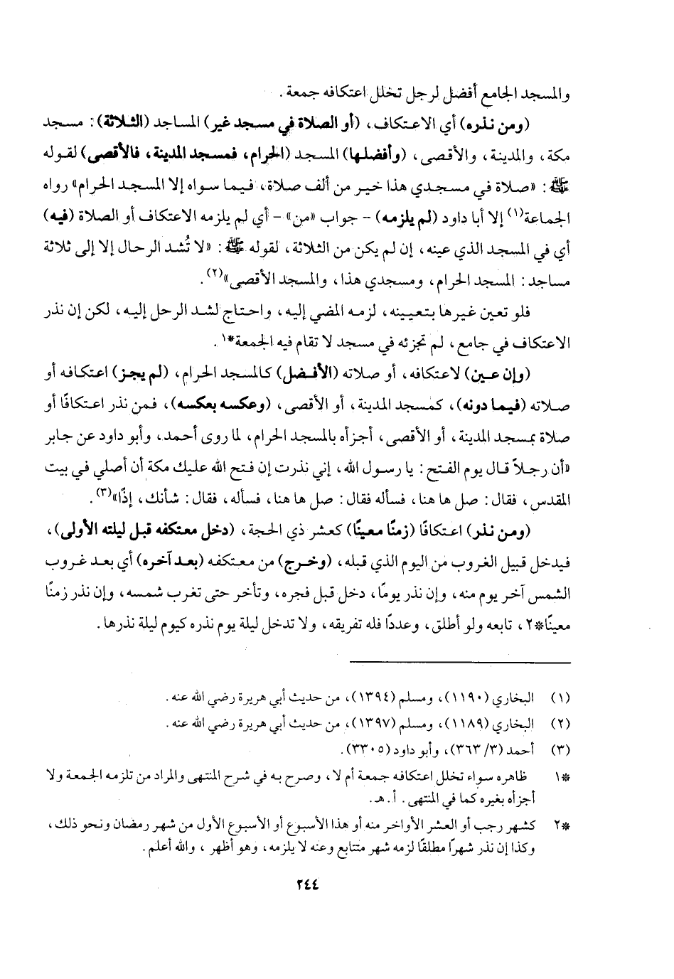 (ومن نذره) أي الاعتكاف (أو الصلاة في مسجد غير) المساجد (الثلاثة) مسجد مكة والمدينة والأقصى، (وأفضلها) المسجد (الحرام فمسجد المدينة فالأقصى) لقوله - صَلَّى اللَّهُ عَلَيْهِ وَسَلَّمَ -: «صلاة في مسجدي هذا خير من ألف صلاة فيما سواه إلا المسجد الحرام» رواه الجماعة إلا أبا داود (لم يلزمه) جواب " من " أي لم يلزمه الاعتكاف أو الصلاة (فيه) أي في المسجد الذي عينه إن لم يكن من الثلاثة لقوله - صَلَّى اللَّهُ عَلَيْهِ وَسَلَّمَ -: «لا تشد الرحال إلا إلى ثلاثة مساجد: المسجد الحرام ومسجدي هذا والمسجد الأقصى» فلو تعين غيرها بتعيينه لزمه المضي إليه واحتاج لشد الرحال إليه، لكن إن نذر الاعتكاف في جامع لم يجزئه في مسجد لا تقام فيه الجمعة، (وإن عين) لاعتكافه أو صلاتها (الأفضل) كالمسجد الحرام (لم يجز) اعتكافه أو صلاته (فيما دونه) كمسجد المدينة أو الأقصى (وعكسه بعكسه) ، فمن نذر اعتكافا أو صلاة بمسجد المدينة أو الأقصى أجزأه بالمسجد الحرام لما روى أحمد وأبو داود عن جابر «أن رجلا قال يوم الفتح: يا رسول الله إني نذرت إن فتح الله عليك مكة أن أصلي في بيت المقدس، فقال: صل ها هنا، فسأله فقال: صل ها هنا. فسأله، فقال: شأنك إذا» .