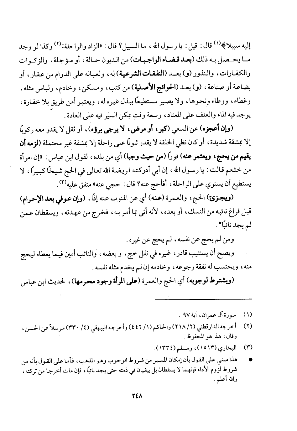 إِلَيْهِ سَبِيلا} [آل عمران: ٩٧] قال: «قيل: يا رسول الله ما السبيل؟ قال: " الزاد والراحلة» وكذا لو وجد ما يحصل به ذلك (بعد قضاء الواجبات) من الديون حالة أو مؤجلة والزكاة والكفارات والنذور (و) بعد (النفقات الشرعية) له ولعياله على الدوام من عقار أو بضاعة أو صناعة (و) بعد (الحوائج الأصلية) من كتب ومسكن وخادم ولباس مثله وغطاء ووطاء ونحوها، ولا يصير مستطيعا ببذل غيره له، ويعتبر أمن الطريق بلا خفارة يوجد فيه الماء والعلف على المعتاد وسعة وقت يمكن السير فيه على العادة.