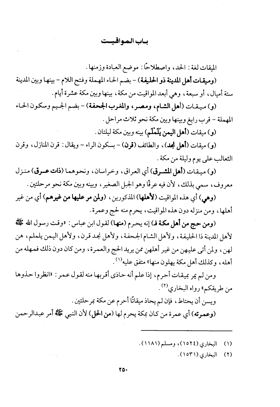 (وميقات أهل المدينة ذو الحليفة) - بضم الحاء وفتح اللام - بينها وبين المدينة ستة أميال أو سبعة، وهي أبعد المواقيت من مكة بينها وبين مكة عشرة أيام. (و) ميقات (أهل الشام ومصر والمغرب الجحفة) - بضم الجيم وسكون الحاء المهملة - قرب رابغ بينها وبين مكة نحو ثلاث مراحل. (و) ميقات (أهل اليمن يلملم) بينه وبين مكة ليلتان. (و) ميقات (أهل نجد) والطائف (قرن) -بسكون الراء- ويقال: قرن المنازل وقرن الثعالب على يوم وليلة من مكة. (و) ميقات (أهل المشرق) أي العراق وخراسان ونحوهما (ذات عرق) منزل معروف سمي بذلك؛ لأن فيه عرقا وهو الجبل الصغير، وبينه وبين مكة نحو مرحلتين. (وهي) أي هذه المواقيت (لأهلها) المذكورين (ولمن مر عليها من غيرهم) أي من غير أهلها، ومن منزله دون المواقيت يحرم منه لحج وعمرة، (ومن حج من أهل مكة فـ) إنه يحرم (منها) لقول ابن عباس: «وقت رسول الله - صلى الله وعليه وسلم - لأهل المدينة ذا الحليفة، ولأهل الشام الجحفة، ولأهل نجد قرن المنازل، ولأهل اليمن يلملم هن لهن ولمن أتى عليهن، من غير أهلهن ممن يريد الحج والعمرة، ومن كان دون ذلك فمحله من أهله، وكذلك أهل مكة يهلون منها» متفق عليه. ومن لم يمر بميقات أحرم إذا علم أنه حاذى أقربها منه لقول عمر: " انظروا إلى حذوها من قديد " رواه البخاري. ويسن أن يحتاط فإن لم يحاذ ميقاتا أحرم من مكة بمرحلتين (وعمرته) أي عمرة من كان بمكة يحرم لها (من الحل) " لأن «النبي - صلى الله وعليه وسلم - أمر عبد الرحمن