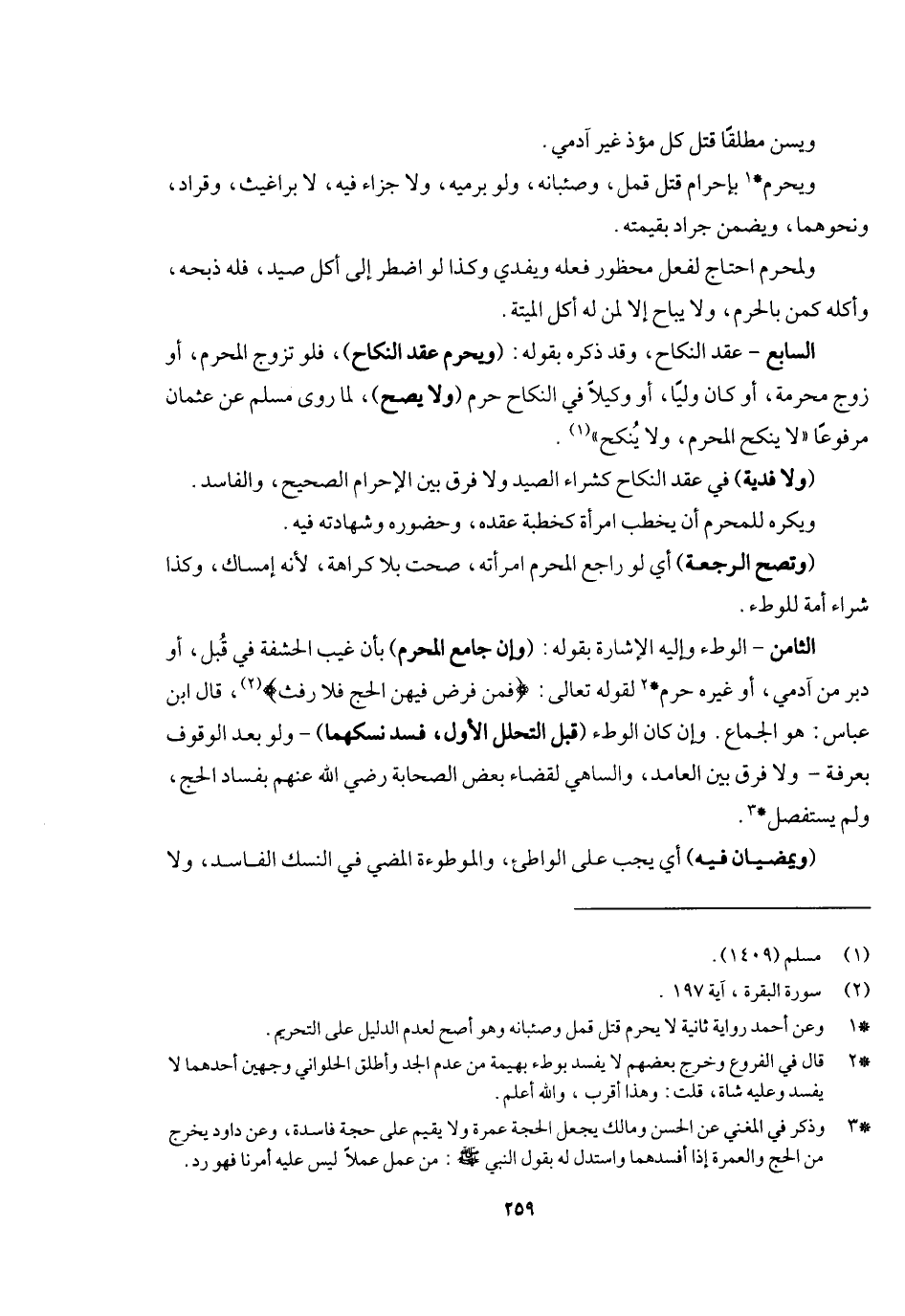 الثامن - الوطء وإليه الإشارة بقوله: (وإن جامع المحرم) بأن غيب الحشفة في قبل أو دبر من آدمي أو غيره حرم، لِقَوْلِهِ تَعَالَى: {فَمَنْ فَرَضَ فِيهِنَّ الْحَجَّ فَلا رَفَثَ} [البقرة: ١٩٧] قال ابن عباس: هو الجماع، وإن كان الوطء (قبل التحلل الأول فسد نسكهما) ولو بعد الوقوف بعرفة، ولا فرق بين العامد والساهي لقضاء بعض الصحابة - رَضِيَ اللَّهُ عَنْهُمْ - بفساد الحج ولم يستفصل، (ويمضيان فيه) أي يجب على الواطئ والموطوءة المضي في النسك الفاسد ولا