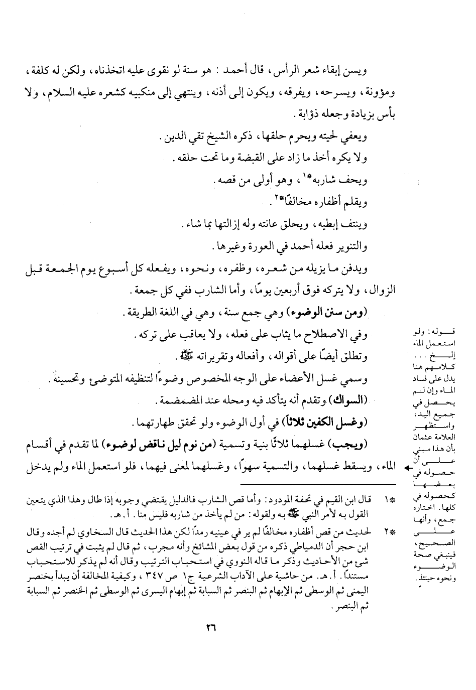(ومن سنن الوضوء) وهي جمع سنة، وهي في اللغة الطريقة، وفي الاصطلاح ما يثاب على فعله ولا يعاقب على تركه، وتطلق أيضا على أقواله وأفعاله وتقريراته - صَلَّى اللَّهُ عَلَيْهِ وَسَلَّمَ -، وسمي غسل الأعضاء على الوجه المخصوص وضوءا لتنظيفه المتوضئ وتحسينه. (السواك)