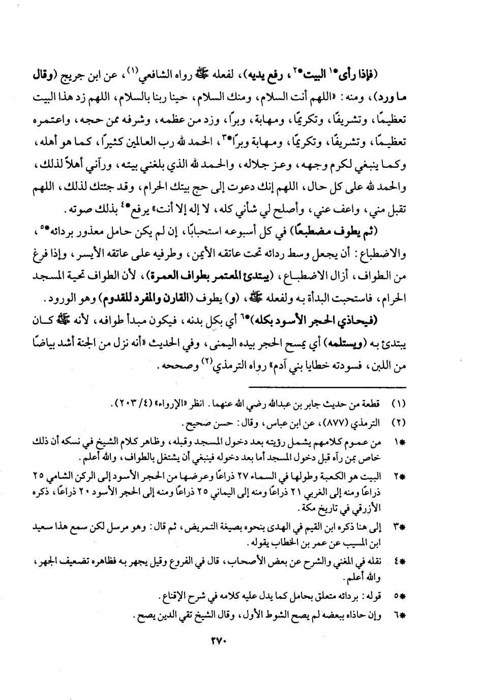 (فيحاذي الحجر الأسود بكله) أي بكل بدنه فيكون مبدأ طوافه؛ لأنه - صَلَّى اللَّهُ عَلَيْهِ وَسَلَّمَ - كان يبتدئ به (ويستلمه) أي يمسح الحجر بيده اليمنى، وفي الحديث: «أنه نزل من الجنة أشد بياضا من اللبن فسودته خطايا بني آدم» رواه الترمذي وصححه،