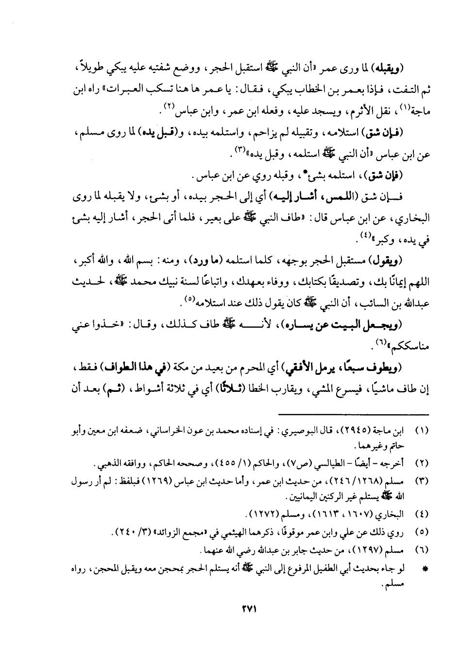 (ويقبله) لما روى عمر «أن النبي - صَلَّى اللَّهُ عَلَيْهِ وَسَلَّمَ - استقبل الحجر ووضع شفتيه عليه يبكي طويلا، ثم التفت فإذا بعمر بن الخطاب يبكي، فقال يا عمر ها هنا تسكب العبرات» رواه ابن ماجه، نقل الأثرم، ويسجد عليه، وفعله ابن عمر وابن عباس، (فإن شق) استلامه وتقبيله لم يزاحم واستلمه بيده وقَبَّلَ يَدَهُ) لما روى مسلم عن ابن عباس «أن النبي - صَلَّى اللَّهُ عَلَيْهِ وَسَلَّمَ - استلمه وقبل يده» ، (فإن شق) استلمه بشيء وقبله؛ لما روي عن ابن عباس، فإن شق (اللمس أشار إليه) أي إلى الحجر بيده أو بشيء ولا يقبله لما روى البخاري عن ابن عباس قال: «طاف النبي - صَلَّى اللَّهُ عَلَيْهِ وَسَلَّمَ - على بعير