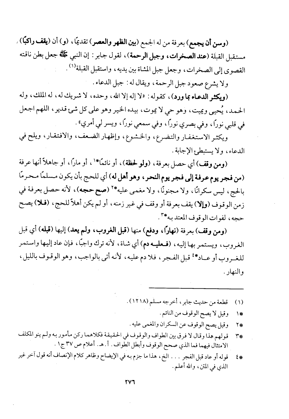 (ويسن أن يجمع) بعرفة من له الجمع بين الظهر والعصر) تقديما، (و) أن (يقف راكبا) مستقبل القبلة (عند الصخرات وجبل الرحمة) لقول جابر: إن النبي - صَلَّى اللَّهُ عَلَيْهِ وَسَلَّمَ - «جعل بطن ناقته القصوى إلى الصخرات وجعل جبل المشاة بين يديه واستقبل القبلة» ، ولا يشرع صعود جبل الرحمة ويقال له: جبل الدعاء (ويكثر الدعاء بما ورد) كقوله: " لا إله إلا الله وحده لا شريك له، له الملك وله الحمد، يحيي ويميت وهو حي لا يموت، بيده الخير وهو على كل شيء قدير، اللهم اجعل في قلبي نورا وفي بصري نورا وفي سمعي نورا، ويسر لي أمري " ويكثر الاستغفار والتضرع والخشوع وإظهار الضعف والافتقار ويلح في الدعاء ولا يستبطئ الإجابة.