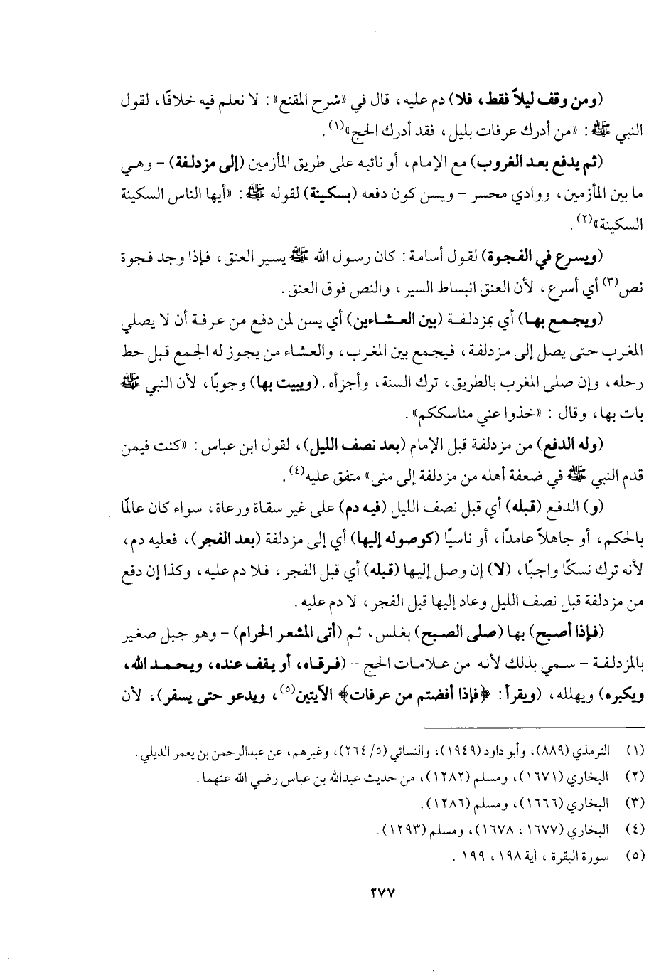 (ثم يدفع بعد الغروب) مع الإمام أو نائبة على طريق المأزمين إلى مزدلفة) وهي ما بين المأزمين إلى ووادي محسر، ويسن كون دفعه (بسكينة) لقوله - صَلَّى اللَّهُ عَلَيْهِ وَسَلَّمَ -: «أيها الناس السكينة السكينة» ، (ويسرع في الفجوة) لقول أسامة: كان رسول الله - صَلَّى اللَّهُ عَلَيْهِ وَسَلَّمَ - «يسير العنق فإذا وجد فجوة نص» أي: أسرع؛ لأن العنق انبساط السير، والنص فوق العنق، (ويجمع بها) أي بمزدلفة (بين العشاءين) أي يسن لمن دفع من عرفة أن لا يصلي المغرب حتى يصل إلى مزدلفة، فيجمع بين المغرب والعشاء من يجوز له الجمع قبل حط رحله، وإن صلى المغرب بالطريق ترك السنة وأجزأه، (ويبيت بها) وجوبا لأن النبي - صَلَّى اللَّهُ عَلَيْهِ وَسَلَّمَ - بات بها، وقال: «خذوا عني مناسككم» ، (وله الدفع) من مزدلفة قبل الإمام (بعد نصف الليل) لقول ابن عباس: «كنت فيمن قدم النبي - صَلَّى اللَّهُ عَلَيْهِ وَسَلَّمَ - في ضعفة أهله من مزدلفة إلى منى» متفق عليه، (و) الدفع (قبله) أي قبل نصف الليل (فيه دم) على غير سقاة ورعاة، سواء كان عالما بالحكم أو جاهلا، عامدا أو ناسيا (كوصوله إليها) أي إلى مزدلفة (بعد الفجر) فعليه دم لأنه ترك نسكا واجبا (لا) إن وصل إليها (قبله) أي قبل الفجر فلا دم عليه، وكذا إن دفع من مزدلفة قبل نصف الليل وعاد إليها قبل الفجر لا دم عليه.