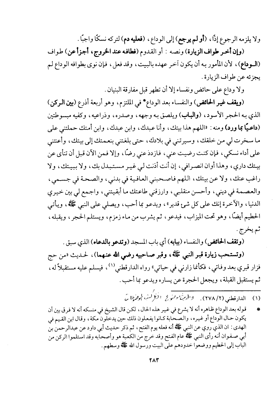 (ويقف غير الحائض) والنفساء بعد الوداع في الملتزم وهو أربعة أذرع (بين الركن) الذي به الحجر الأسود (والباب) ويلصق به وجهه وصدره وذراعيه وكفيه مبسوطتين (داعيا بما ورد) ومنه: " اللهم هذا بيتك وأنا عبدك وابن عبدك وابن أمتك حملتني على ما سخرت لي من خلقك وسيرتني في بلادك حتى أبلغتني بنعمتك إلى بيتك وأعنتني على أداء نسكي، فإن كنت رضيت عني فازدد عني رضا، وإلا فمن الآن قبل أن تنأى عن بيتك داري، وهذا أوان انصرافي إن أنت أذنت لي غير مستبدل بك ولا ببيتك ولا راغب عنك ولا عن بيتك،